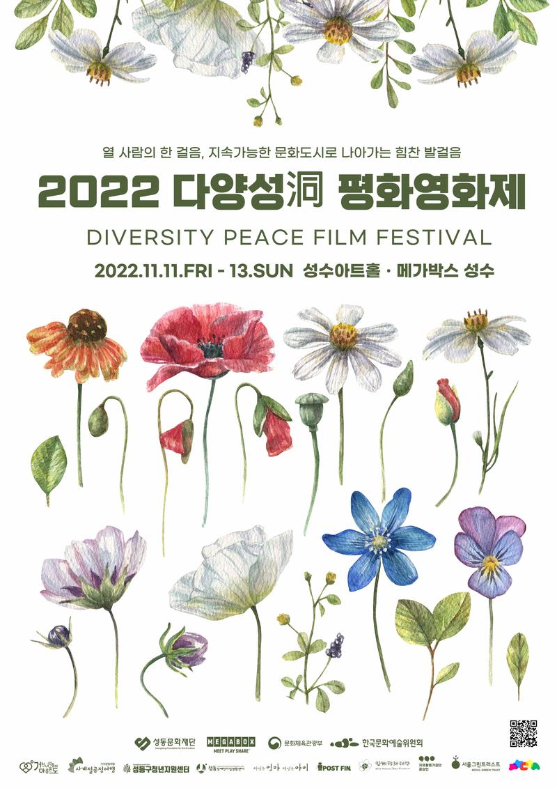 2022 다양성洞 평화영화제 무료관람 신청 안내 (공모 선정작 상영) 올해로 3회째를 맞이하는 ‘다양성동 평화영화제’는 ‘열 사람의 발걸음, 지속가능한 문화도시로 나아가는 힘찬 발걸음’의 부제 아래, 일상 속 평화의 의미를 재발견하여 지역구성원이 함께 상생하고 공존하는 삶의 가치를 확산하고자 합니다. 많은 관심과 참여 부탁드립니다! ◈ 11. 11.(금)\~11. 13.(일) ◈ 성수아트홀, 메가박스 성수 1관 ◈ 전체 관람가, 12세 이상 관람가 ◈ 성동구민 및 일반시민 무료 [신청 링크] https://forms.gle/5npfe4mbUWZ7exwp9
