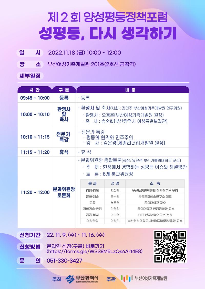 「제2회 양성평등정책포럼」 개최 및 참여신청 안내 부산여성가족개발원에서는 제2회 양성평등정책포럼을 개최합니다. 성평등에 관심있는 일반 시민분들의 많은 참여 부탁드립니다 □ 제2회 양성평등정책포럼 개요 ○ 일 시 : 2022년 11월 18일(금) 10:00\~12:00 ○ 장 소 : 부산여성가족개발원 201호(2호선 금곡역) ○ 참석대상 : 성평등에 관심있는 시민(선착순 50여명, 신청자에 한해 참석 가능) ○ 주 제 : 성평등, 다시 생각하기 ○ 세부일정