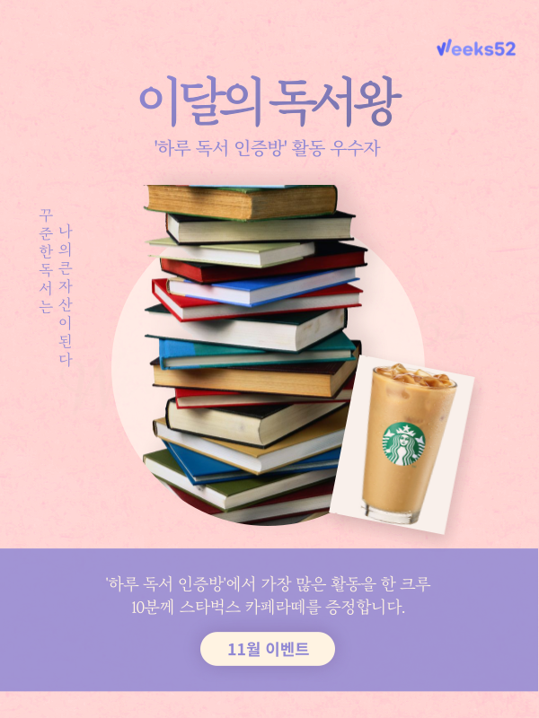가을은 독서의 계절🍁 꾸준한 독서로 독서 습관을 들여보는 건 어떨까요? Weeks52 디스코드 서버의 ‘하루 독서 인증방’에서 가장 많은 활동을 한 크루 10명에게 ☕스타벅스 카페라떼 기프티콘☕을 증정합니다!