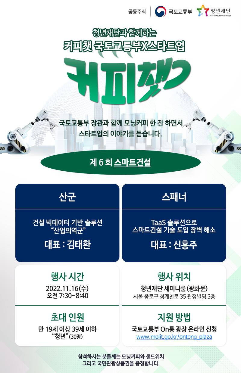 청년재단과 함께하는 국토교통부×스타트업 커피챗 원희룡 국토교통부 장관과 함께 모닝커피 하면서 스타트업의 이야기를 듣습니다. 커피챗의 여섯번째 주제는 바로! '스마트건설'입니다. ✅커피챗이 소개할 스타트업 1) 건설 빅데이터 기반 솔루션 "산업의역군" 김태환 대표 2) TaaS 솔루션으로 스마트건설 기술 도입 장벽 해소 "스패너" 신흥주 대표 ✅행사시간 2022.11.16.(수) 오전 7:30\~8:40 ✅행사위치 청년재단 세미나룸(광화문) 서울 종로구 청계천로 35 관정빌딩 3층 ✅초대인원 만 19세\~39세 "청년" 30명 (신청자에 한하여 개별통보) ✅신청방법 국토교통부 on통광장 신청(링크) https://www.molit.go.kr/2022coffeechat6/main.jsp *참석하시는 모든 분들께는 모닝커피와 샌드위치, 국민관광상품권을 증정합니다. 많은 관심과 참여 부탁드리겠습니다!