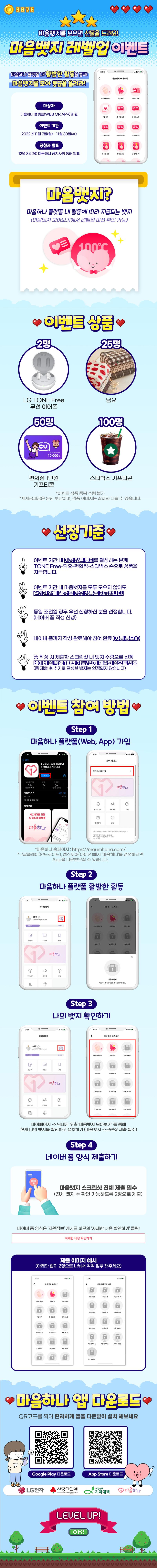 ⭐마음뱃지 레벨업 이벤트⭐ 마음하나 플랫폼 내 활발한 활동으로 마음뱃지를 모아 등급을 올려보세요!✨ 많이 모으면 모을수록 당첨 확률 UP! 푸짐한 선물을 드립니다🧡 ✅ 이벤트 참여 바로가기�* 마음하나 인스타그램 프로필링크 클릭!�✨ https://maumhana.com/home/bridge/205 📌마음뱃지? 마음하나 플랫폼 내 활동에 따라 지급되는 뱃지로, 마이페이지-마음뱃지 모아보기에서 레벨업 미션을 확인할 수 있어요! ✅대상자 : 마음하나 플랫폼(Web or App) 회원 ✅이벤트 기간 : 11월 7일(월)\~11월 30일(수) ✅당첨자 발표 : 12월 8일(목) 마음하나 홈페이지 공지사항 통해 발표 ✅이벤트 참여방법 STEP 1. 마음하나 플랫폼(Web, App 모두 가능) 회원가입 *마음하나 홈페이지 : https://maumhana.com/ *구글플레이(안드로이드), 앱스토어(아이폰)에서 ‘마음하나’를 검색하시면 App을 다운받으실 수 있습니다. STEP 2. 마음하나 플랫폼 내 활발한 활동하기 (마음뱃지별 미션은 마음뱃지 모아보기에서 확인 가능) STEP 3. 마이페이지-마음뱃지 모아보기에서 나의 뱃지를 확인하고 캡쳐하기 STEP 4. 네이버 폼 양식 제출하기 (네이버 폼 양식은 '지원정보' 게시글 하단에 '자세한 내용 확인하기' 클릭!) 📍마음뱃지 캡쳐 시 반드시 전체 뱃지가 나오도록 이미지 2장으로 제출해주세요! ✅선정 기준 1) 이벤트 기간 내 가장 많은 뱃지를 달성하는 분께 [TONE Free-담요-편의점-스타벅스] 순으로 상품을 지급합니다. 2) 이벤트 기간 내 마음뱃지를 모두 모으지 않아도 순위 권 안에 해당 할 경우 상품을 지급합니다. 3) 동일 조건일 경우 우선 신청하신 분을 선정합니다. (네이버 폼 작성 신청) 4) 네이버 폼까지 작성 완료해야 참여 완료 (자동 응모X) 5) 폼 작성 시 제출한 스크린샷 내 뱃지 수량으로 선정하며 네이버 폼 작성은 1회만 가능, 먼저 제출한 폼으로 인정합니다. (폼 제출 후 추가로 달성한 뱃지는 인정되지 않습니다.)