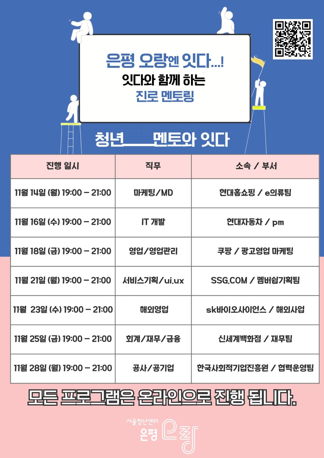 현직자 취업 경험 공유 구체적인 취업 준비 방법 학습 직무별 커리어 탐색을 얻어 갈 수 있습니다. 또한 수업이 끝난 이후, 현직자에게 자율적인 1대1 멘토링(무료)도 받을 수 있습니다. 모든 프로그램은 온라인으로 진행 됩니다. https://bit.ly/은평오랑잇다멘토링