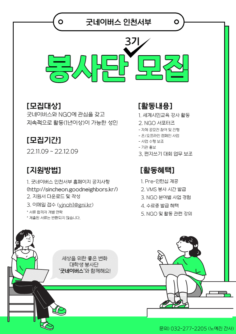 ■ 주최사/활동명 굿네이버스 인천서부지부 NGO 봉사단 3기 ■ 활동내용 세계시민교육 강사 활동(학교폭력예방교육강사, 세계시민교육 강사) NGO 서포터즈 활동 편지쓰기대회 사업 보조 ■ 지원방법 ‘굿네이버스 인천서부지부’ 홈페이지 접속 (http://sincheon.goodneighbors.kr/) ‘공지사항’에서 지원서 다운로드 및 작성 메일 접수(yjnoh1@gni.kr) *서류 합격자 개별 연락 ■ 활동혜택 다양한 실무경험 봉사시간(VMS)인증 수료증 발급 입사시 Pre 인턴십 발급 NGO 및 활동 관련 강의 NGO 분야별 사업 경험 ■ 문의 굿네이버스 인천서부지부 노예진 간사 (032-277-2205)