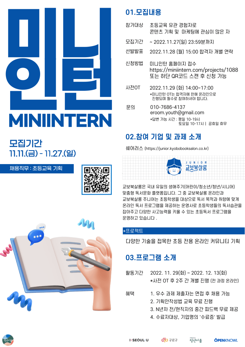 ▶ 활동명 [미니인턴X쉐어러스] 실무 쌓고 취업할 사람 지금 당장 주목! 쉐어러스에서 초등교육 기획자 직무 인턴을 모집합니다. (\~11/27)