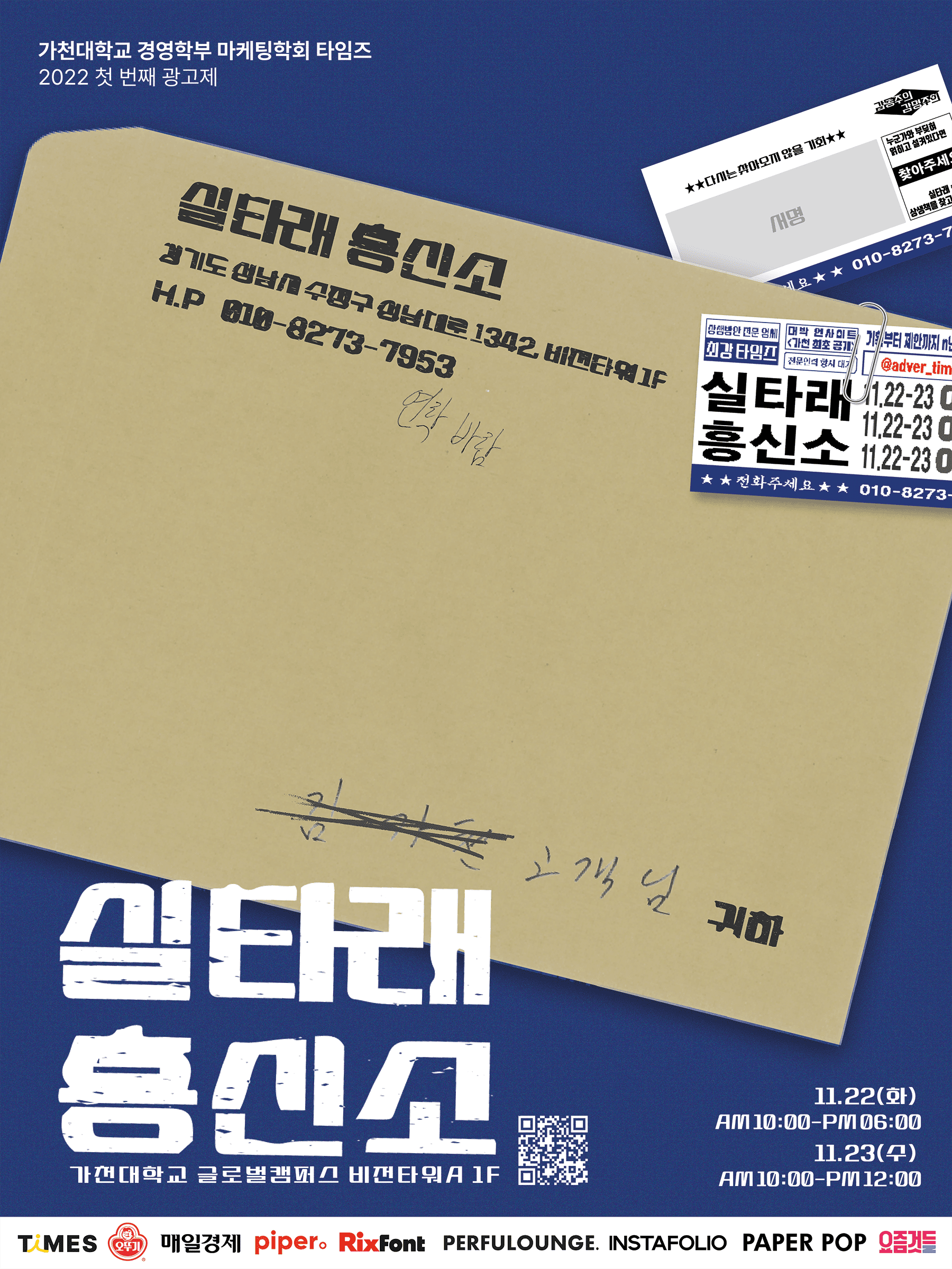 □ 광고제 소개 타임즈의 2022 광고제는 '실타래 흥신소'라는 큰 주제 하에 진행됩니다. 실타래 흥신소는 사회 속 작은 갈등부터 큰 갈등까지, 모든 영역의 갈등을 아울러 함께 살아가는 법을 제안하며 관람객들로 하여금 갈등으로 얽히고 설킨 실타래가 풀어야 하는 문제가 아닌 그 자체로 함께 어울리며 살아가는 세상임을 전하고자 합니다. TIMES 구성원들로 이루어진 각 팀은 하나의 사회갈등을 주제로 선정하여 해당 주제를 분석, 이를 해결할 수 있는 광고 아이디어를 제안하고, 각 팀의 광고 아이디어들을 직접 실현하여 관람객 참여형 광고물을 전개합니다. □전시 정보 -전시 기간 : 2022년 11월 22일 10:00 AM \~ 18:00 PM / 11월 23일 10:00AM \~ 12:00 PM -전시 장소 : 가천대학교 글로벌캠퍼스 비전타워A 1F -경기도 성남시 수정구 성남대로 1342 1층 (가천대역 1번 출구 앞) □ 팀 부스 소개 퍼슨 “우리는 퍼슨들” 퍼슨들 안녕하신가요? 의뢰인 회사 잠입 후 ‘요즘 것들’ 단어를 52번 들었다. 부장 말을 듣는 사람들 표정은 어두웠고, 자리를 피하기도 했다. 사람들은 부장을 향해 ‘꼰대’란 단어를 썼다. '요즘 것들’과 ‘꼰대’. 서로를 세대 단어로 판단하는 이들에게 프레임을 깰 수 있게 해주면 어떨까? PERSONs. 세대가 아닌 개인 대 개인으로 마주하게끔 하자. 자유로운외침 “나도 모르게 혹시?” 의뢰인님이 생각하는 정의의 기준은 무엇인가요? 당신은 도덕성에 따라 행동했을지 모르지만, 누군가는 그 행동에 불편함을 느끼고 있답니다. 당신의 도덕적 기준에 맞춰 판단하지 말고 다름을 인정해 주세요. 오늘은 이 실타래 흥신소를 통해 자기검열을 일삼는 이들의 말에 귀 기울여보는 것은 어떨까요? 똑똑 “벽을 넘어” 그 너머에는 뭐가 있나요? 모두가 웃는 무리 속 그 벽 너머에는 보이지 않는 표정이 존재한다. 여행객들은 자신들의 행복을 찾아 그곳에 왔지만 거기에 살고 있는 사람들은 정작 웃지를 못한다. 이제는 서로가 쉴 수 있는 거리를 만들 때이다. 내가 놀러 간 그곳도 누군가에게는 집이라는 사실을, 망각했던 그 사실을 알려줘야 할 때이다. 역지사지 “20초의 공백” 분명 아무도 없는데도 뒤통수가 따갑다. 뒤에 누군가 있기라도 하면 덜컥 겁부터 난다. 키오스크 앞에서 머뭇거리던 어르신들은 오늘도 결국 발걸음을 돌린다. 왜 우리는 그들의 용기에 손 내밀어 주지 못할까? 식사를 하지 못한 배고픔보다 누구도 어려움에 공감하지 않는 현실에 배고픔을 느끼는 어르신들, 그들이 마주하는 두려움과 압박감을 체험해 보자. □ 브랜드 부스 소개 매일경제 “내일의 메일” 인터넷을 통해 빠르게 정보를 얻고 기사를 통해서 사람들의 다양한 생각을 볼 수 있는 편리한 시대에 살고 있는 의뢰인. 그러나 가짜 뉴스가 판을 치고 사람들의 답글은 자신의 의견이나 생각이 아닌 각종 비난들과 욕 뿐이다. 진실된 정보와 사람들의 다양한 생각을 마음껏 보고 느낄 수 있는 곳을 알려줘야 한다. 오뚜기 “#진라면을_보라” 민초단과 반민초단, 부먹파와 찍먹파 많은 호불호 게임의 중심에 있는 진매파와 진순파 하지만, 논쟁의 절대다수인 진매파들로 인해 자신이 좋아하는 라면을 자신있게 말할 수 없는 의뢰인. 진매파와 진순파를 하나로 융화시킬 수 있는 방법은 없을까? 진매의 빨강과 진순의 파랑을 섞으면? 서로를 바라보는 부정적인 시선들을 뒤집고, 갈등없는 "보랏빛 세상으로 물들여보자!" □ 협력사 소개 퍼퓨라운지 “ WE REALLY RESPECT YOUR SCENT TASTE!” @perfulounge https://perfu-lounge.com/ 페이퍼팝 “부담없이 사용하고 자유로운 제로웨이스트 일상을 만듭니다” @paperpopkorea https://www.paperpop.co.kr/index.html 파이퍼 “논픽션으로 만나는 새로운 세상” @piper.read https://piper.so/ 요즘것들 “MZ 세대처럼 폭풍 성장하는 MZ세대 전문 홍보 매체” @all_for_young https://allforyoung.com/ 인스타폴리오 “가장 쉽고 빠르게 포트폴리오 계정을 만드는 방법” @instafolio.official https://linktr.ee/instafolio 릭스폰트 “기본을 더 완벽하게, 폰트를 더-새롭게!” @fontrix_rix https://www.rixfontcloud.com/ □문의 -실타래흥신소 홈페이지 https://url.kr/8t5y4n -타임즈 인스타그램 @adver_times 베일에 싸인 실타래 흥신소에 관한 숨은 정보를 듣고 싶으시다면? 아래 번호로 전화 주세요 010-8273-7953