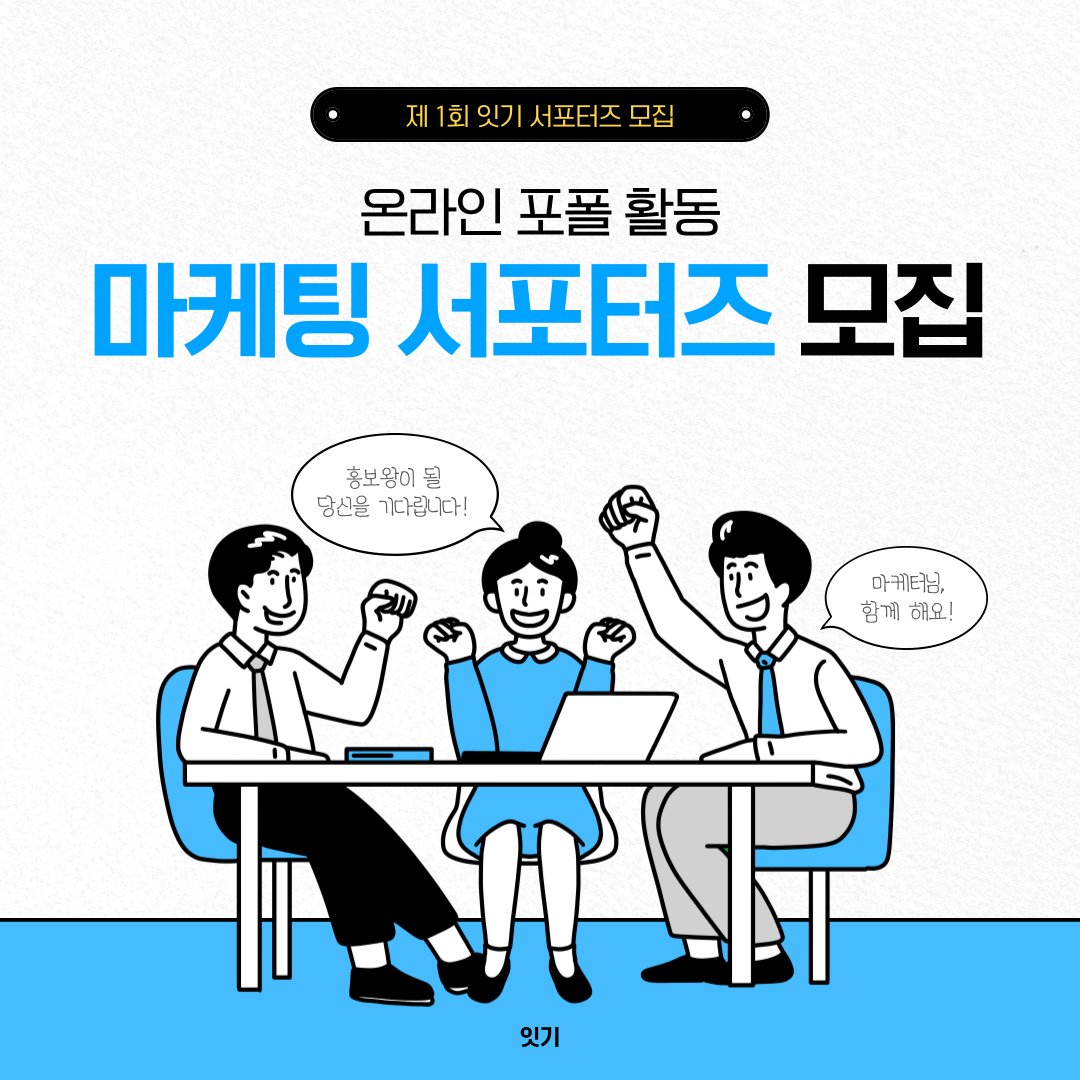 안녕하세요, 여러분 :) 잇기를 운영하는 송사장입니다. [잇기]는 현재 IT PM/PO직 및 기획교육을 진행하고 있습니다. . 서포터즈 여러분들과 함께 잇기를 마케팅하고자 합니다. 그 어떤 대외활동 보다도 가장 보람차고 의미가 있는 활동을 남겨드리겠습니다! 잇기와 [진짜 마케팅]을 함께 해보실 분들을 구합니다. . * 잇기 서포터즈만의 특징 * 1. 여러분들의 의견이 많이 반영되는 활동이 될 것 입니다. 2. 마케팅 멘토링이 함께 진행됩니다. 3. 결과가 좋다면 그에 따른 보상도 이뤄집니다. . * 이런분들 신청해 주시면 좋아요 * 1. 마케팅 직군을 꿈꾸며 경험해 보고 싶으신 분 2. 온&오프라인 마케팅 활동에 열려 있으신 분 3. SNS활동이 활발하신 분 4. 서포터즈 팀활동에 있어 시간적 여유가 있으신 분 . * 모집인원 * 1. 총 15명 . * 일정 * 1. 모집기간 : 11/14 \~ 11/25 2. 발표일자 : 11/26 3. 오리엔테이션 : 11/27 오후 8:00 4. 활동기간 : 11/28 \~ 12/23 . * 이런 활동을 합니다 * 1. 잇기 브랜드 대외 홍보 2. 마케팅 콘텐츠 제안 3. 관심사가 맞는 동료들과 팀 형성 4. 실무와 유사한 회의 및 KPI . * 혜택 * 1. 서포터즈 활동 수료증 지급 2. 팀단위 프로젝트 경험 3. 성과에 따른 인센티브 지급 4. 실무와 유사한 시스템 경험 . * 신청방법 * 링크에 접속하여 신청해주세요! https://forms.gle/bkPYRDEbhecmTtyMA . * 문의 * 카톡 : https://open.kakao.com/o/sUyKZ3te