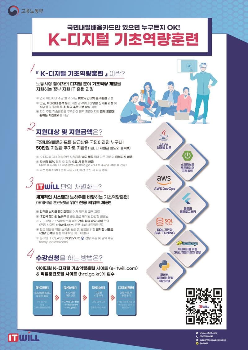 3. 상담문의: - 02-6255-8033, 8092, support@easyupclass.com - K-디지털 기초역량훈련: www.e-itwill.com - IT 온라인교육 플랫폼: www.easyupclass.com (IT 기초부터 실무까지 총 300여개의 핵심과정)