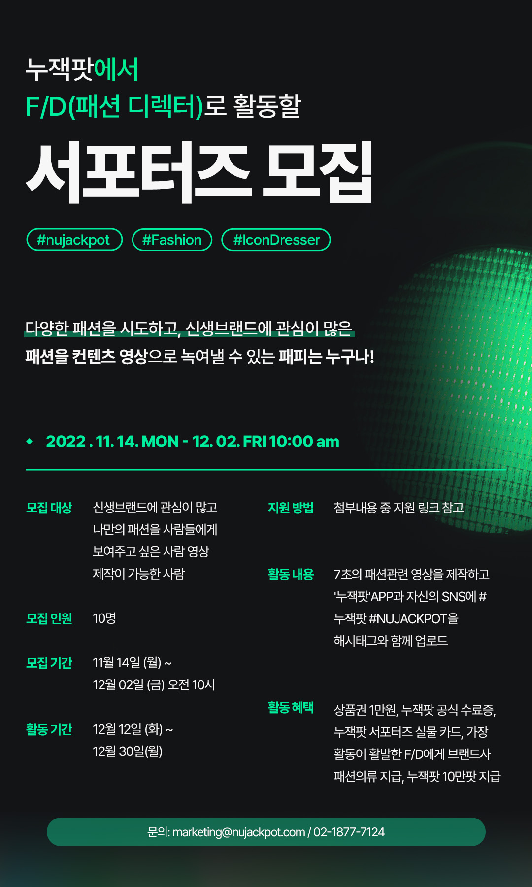앱 내 7초 길이의 영상 콘텐츠를 제작해주실 패션에 관심이 많으시고, 새로운 패션에 도전하시는 분! 나만의 패션을 남들에게 자랑하고 싶으신 분들을 대상으로 서포터즈를 모집하고 있습니다. 휴학생, 졸업생 상관없이 지원 가능하며, 별도의 대면 발대식이 없어 전면 비대면으로 진행됩니다.