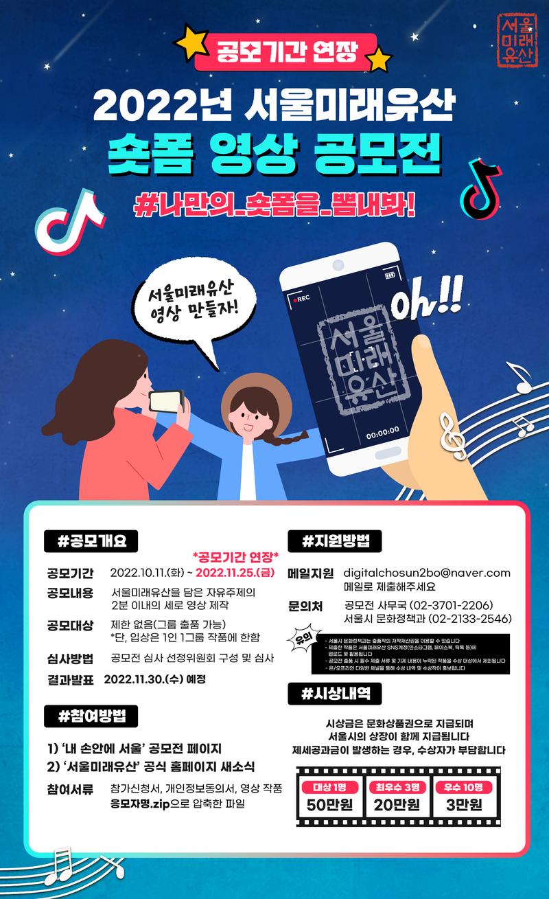 참가신청서 및 개인정보동의서 다운로드 후 영상과 함께 <응모자명.zip>으로 압축해서 메일 접수해주세요 digitalchosun2bo@naver.com ⠀ 👉결과 발표 : 2022.11.30(수) 예정일로 변경될 수 있습니다. ⠀ 👉시상 내역 대상: 문화상품권 50만원(1명) 최우수상: 문화상품권 20만원 (3명) 우수상: 문화상품권 3만원 (10명) ⠀ 👉 자세한 내용은 '서울미래유산' 홈페이지에서 확인하세요! ⠀ 여러분의 많은 관심과 참여 부탁드립니다❤️