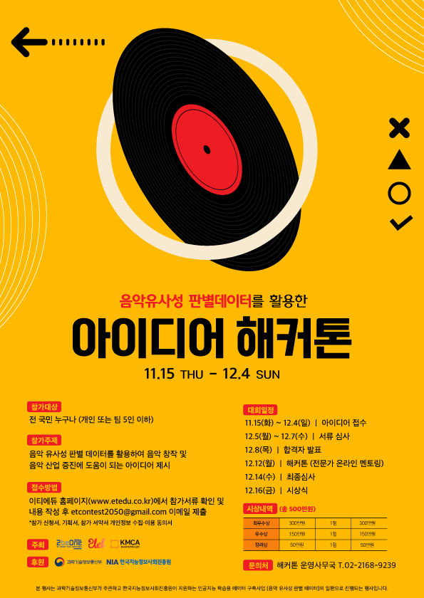본 행사는 과학기술정보통신부가 주관하고 한국지능정보사회진흥원이 지원하는 인공지능 학습용 데이터 구축사업 [음악 유사성 판별 데이터]의 일환으로 진행되는 행사입니다.
