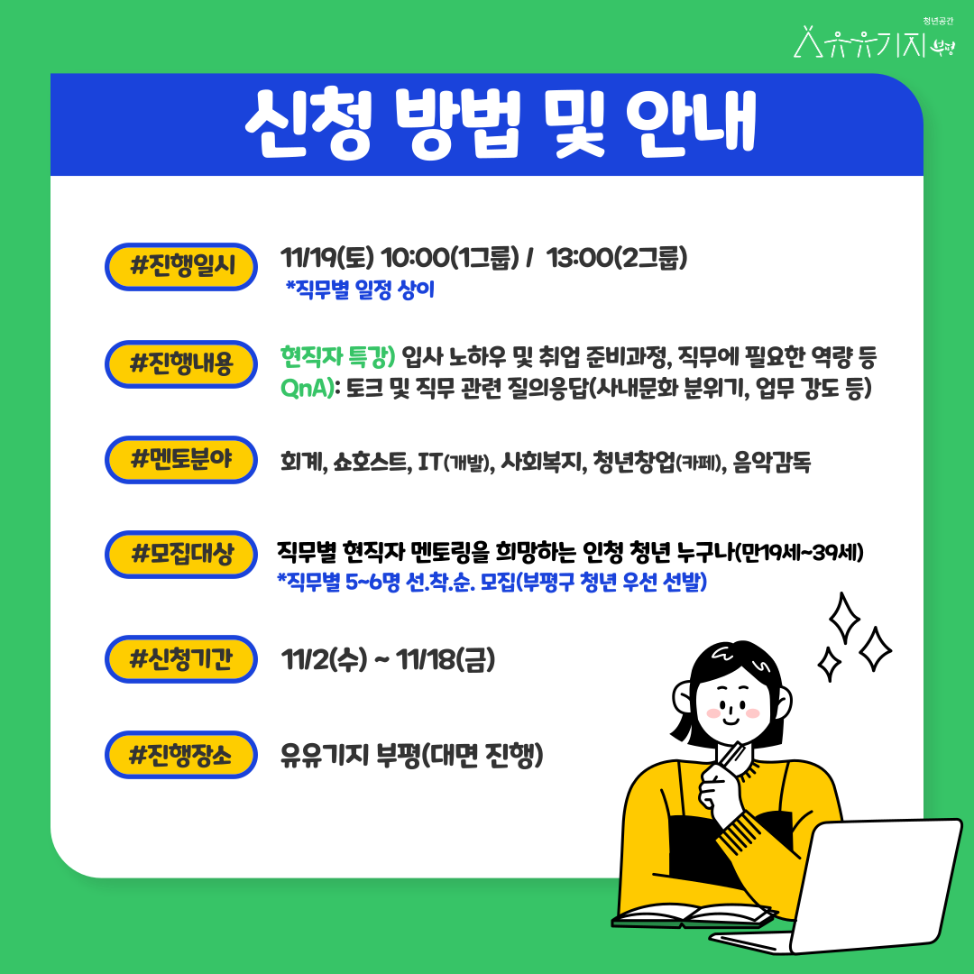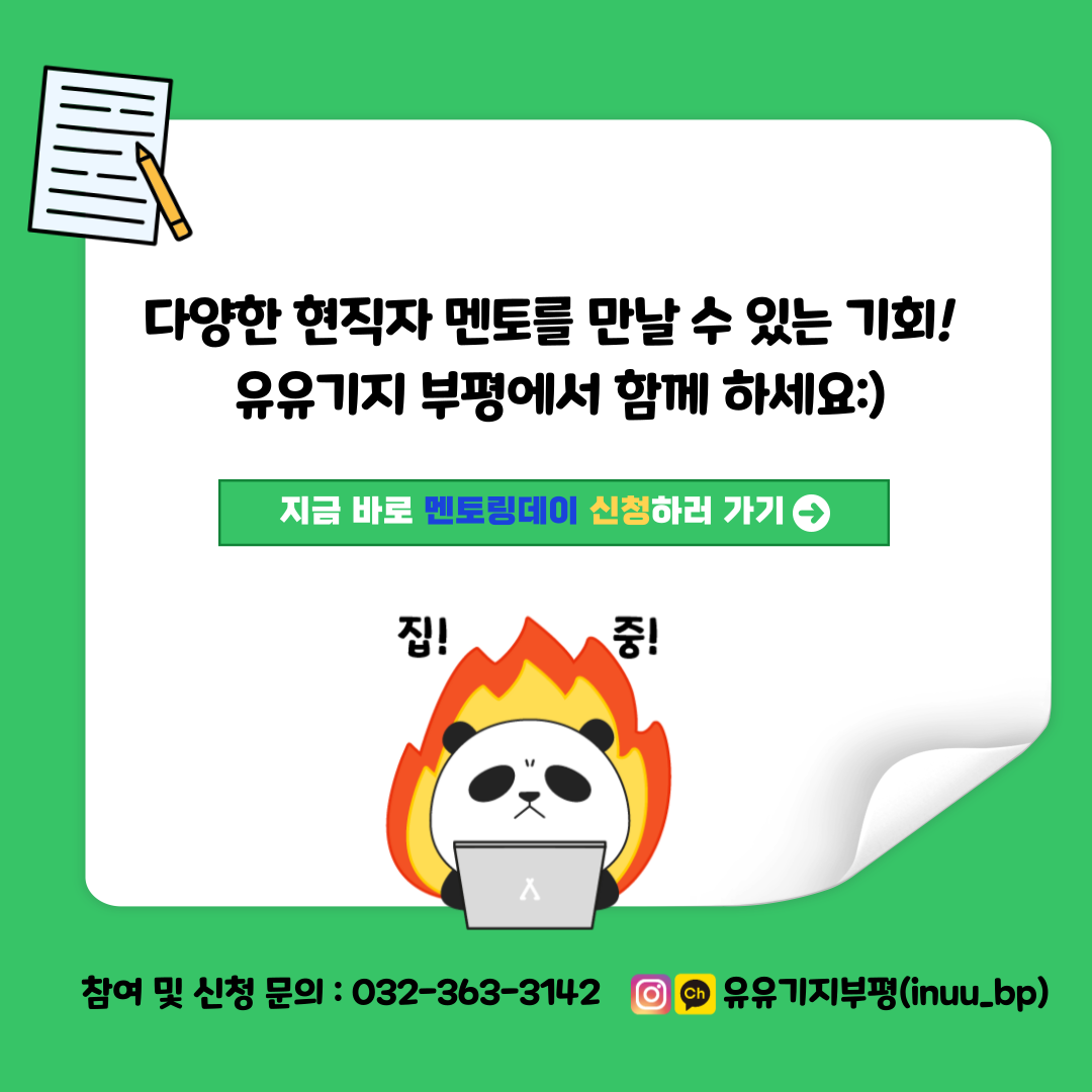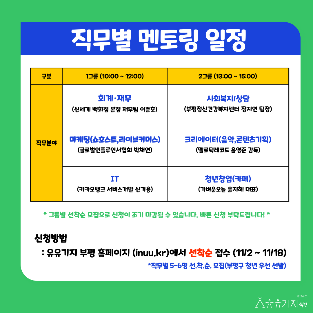 두둥! 다양한 현직자 멘토를 만날 수 있는 기회! 드디어 하반기 청년 멘토링 데이 모집이 시작되었습니다! [모집대상] : 직무별 현직자 멘토링을 희망하는 인천 청년(만 19세\~39세) *부평구 청년 우선 선발* [직무분야] : 회계, 마케팅(쇼호스트,라이브커머스), IT개발, 사회복지(정신), 크리에이터(음악,콘텐츠기획), 청년 창업(카페) [모집기간] : 11/2(수) \~ 11/18(금) [진행일시] : 11/19(토) 10:00, 13:00 (직무별 일정 상이) [모집인원] : 직무별 5\~6명 (선착순 마감) [진행장소] : 유유기지 부평(대면) [신청방법] : 유유기지 부평 홈페이지 접수(선착순 마감 예정) [진행방법] : 직무별 5\~6명 소그룹 멘토링 [진행내용] -현직자 특강 : 입사노하우 및 취업 준비 과정, 직무에 필요한 역량, 직무경험 등 -멘토링 QnA : 현직자와 함께하는 토크 및 직무 관련 질의 응답 [문의사항] : 032-363-3142 *멘토 소개 -회계 : 신세계 백화점 재무팀 이준호 -마케팅(쇼호스트,라이브커머스) : 입주마당 박채연 -IT개발 : 카카오뱅크 서비스개발 신기용 -사회복지(정신) : 부평정신건강복지센터 장지연 -크리에이터(음악) : 멜로틱 윤영준 -청년 창업(카페) : 가벼운 오늘 윤지혜 ★신청 링크 : https://bit.ly/3DRqgqs★ 인스타그램 : https://www.instagram.com/inuu_bp/ 직무별 현직자와 함께하며 취업 고민은 다운, 경쟁력은 업하는 시간을 유유기지 부평과 함께하세요:) 빠른 마감이 예상되오니, 얼른 신청하세요!