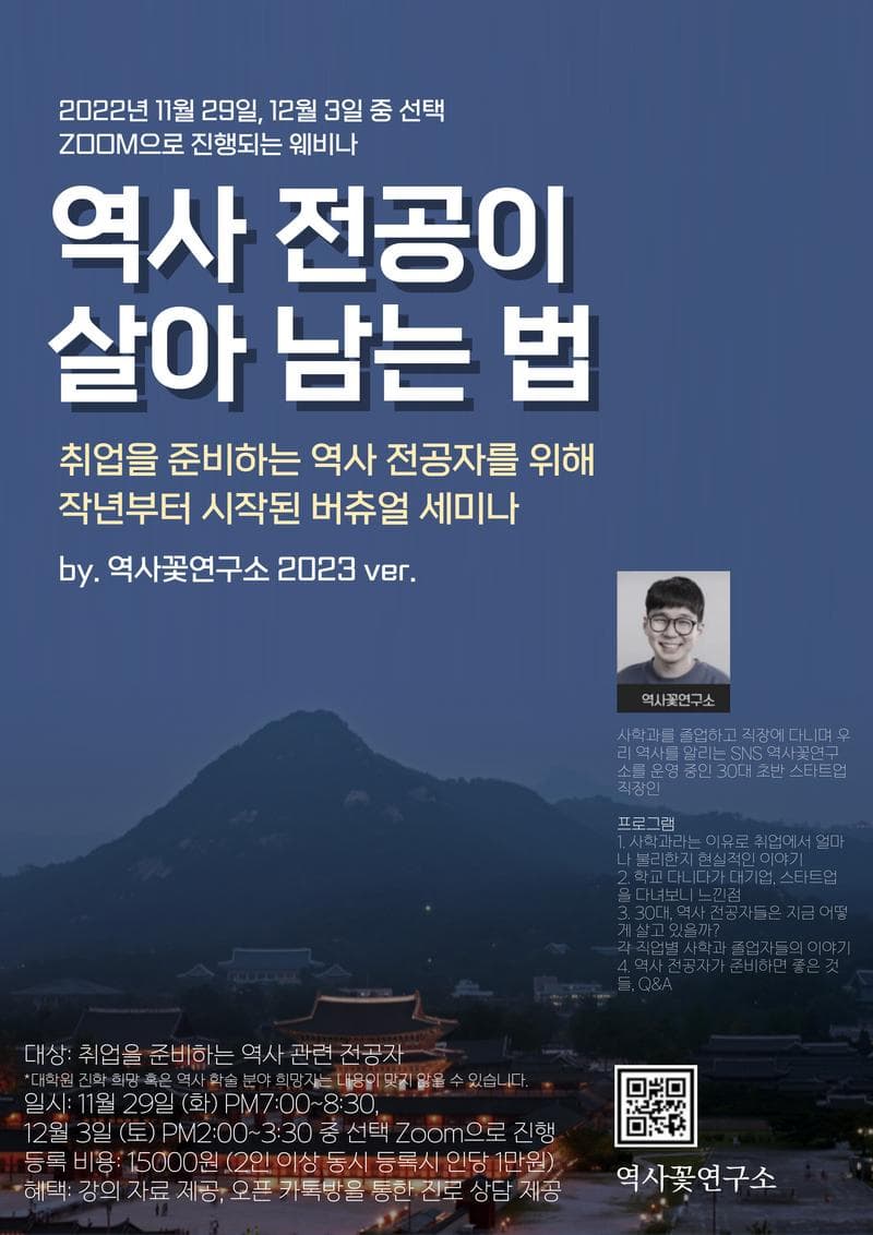 역사 전공자는 많지만, 역사 쪽 전공을 살릴 수 있는 진로는 많지 않습니다. 사학과를 나와서 스타트업에 다니면서, 사학과 후배들이 미래를 조금 더 잘 그릴 수 있도록 도움을 줄 수 있는 온라인 세미나를 작년에 이어 올해도 준비했습니다. 취업을 준비하고 있는 역사 관련 전공이나 넓게는 인문학 전공자 누구나 참여가 가능하며, 사전 질문을 통해 도움이 될만한 내용들을 미리 담아서 역사꽃연구소에서 알차게 꾸릴 예정입니다. 프로그램 1. 사학과라는 이유로 면접에서 듣는 말 2. 학교 다니다가 회사 다녀보니 느낀 점 3. 30대\, 여러 학교 역사 전공 친구들은 어떻게 살고 있을까? (은행원\, 대기업\, 중소/스타트업\, 공기업\, 공무원 등) 4. 역사 전공자가 준비하면 좋을 것들 5. Q&A 대상 취업을 준비하는 역사 관련 전공자 (재학/졸업) *대학원 진학 희망자 및 역사 분야 희망자는 내용이 맞지 않을 수 있습니다.