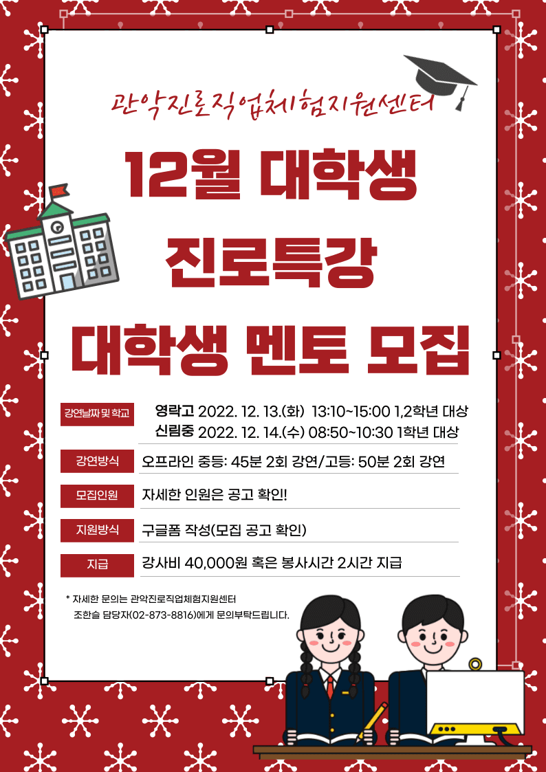 안녕하세요. 관악진로직업체험지원센터입니다. 관악구에 위치한 학교에서 12월 대학생 진로특강을 진행할 대학생(휴학생, 대학원생 포함) 멘토를 모집합니다.