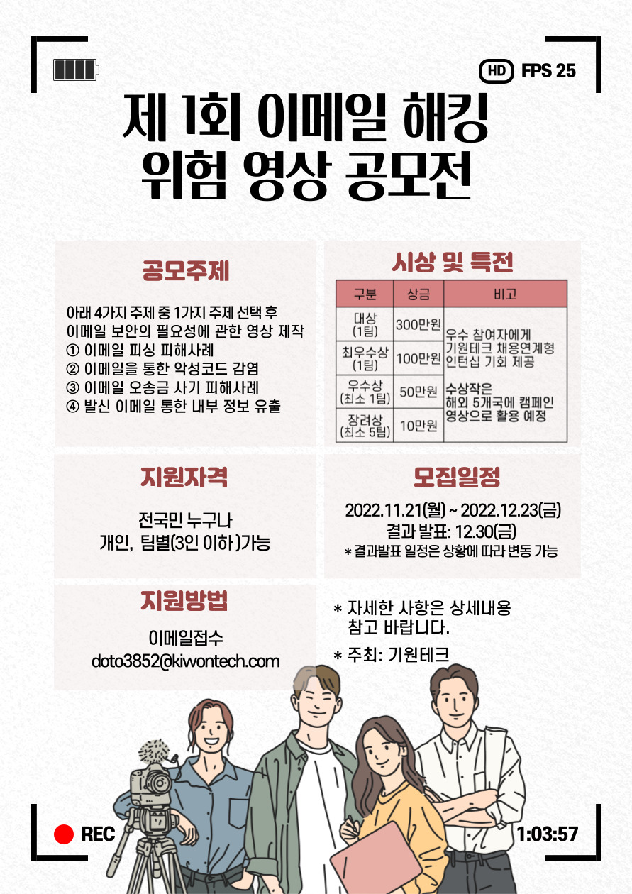 제 1회 이메일 해킹 위험 영상 공모전 ■ 공모주제 아래 4가지 주제 중 1개의 주제를 선택하여 이메일 보안의 필요성에 관한 영상을 제작해주세요. - 이메일 피싱 피해사례 - 이메일을 통한 악성코드 감염 - 이메일 오송금 사기 피해사례 - 발신 이메일 통한 내부 정보 유출 ■ 기간 및 일정 - 2022년11월 21일(월) \~12월 23일(금) 18시까지 결과발표: 12.30(금) ※ 결과발표 일정은 상황에 따라 변동 가능 * 수상자에게 개별 연락 예정 ■ 지원자격 - 누구나 참여 가능 개인, 팀별(3인 이하) 가능 ■ 출품규격 최소 60초 이상의 영상 (길이 제한 X) - 1280 * 720 이상 (가로형 비율) / mp4, mov, avi 형식의 동영상 파일 영상의 장르에 대한 제한은 없음 ■ 심사기준 - 완성도 - 창의성 - 활용성 영상 길이에 따른 추가 점수 혹은 불이익은 없음 (최소 60초 이상) ■ 시상내역 - 대상(1팀) : 상금 300만원 - 최우수상(1팀) : 상금 100만원 - 우수상(최소 1팀) : 상금 50만원 장려상(최소 5팀) : 상금 10만원 - 우수참여자에게는 기원테크 글로벌 온라인 마케팅 직무 인턴십 기회를 제공할 예정입니다. - 수상작은 해외 5개국에 캠페인 영상으로 활용될 수 있습니다. ※ 우수상과 장려상의 수상자 수는 변동될 수 있습니다. ※ 상금에 대한 제세공과금은 수상자가 부담합니다. ■ 접수방법 : 이메일 접수 / doto3852@kiwontech.com - 참가신청서와 개인정보 동의서, 출품규격에 맞는 동영상 파일을 함께 제출 ■ 유의사항 - 접수된 작품은 수정 및 취소가 불가하며, 접수된 서류는 일절 반환하지 않음 - 1인(팀) 1개 작품까지만 응모 가능 (공고 이후 제작된 작품이어야 함) - 수상작에 대한 소유권, 저작권 일체(모든 저작권, 2차적 제작물 및 편집저작물의 작성권 등을 포함)는 기원테크(주)에 귀속되며, 향후 기원테크 홈페이지, 블로그 등 온라인 상에 게시, 홍보자료 활동 및 공적인 목적으로 제3자에게 제공 가능 제출 작품은 미발표 및 순수창작물이어야 하며, 초상권, 저작권, 지적소유권, 음원, 재산권, 대여권 등(사진, 이미지, 폰트 등)의 이용에 법적인 문제가 발생한 경우 수상 취소 및 상금 반환 조치되며, 법적인 책임을 비롯한 모든 책임은 참가자(본인)에게 있습니다. - 일정과 시상 내용은 일부 변경될 수 있으며, 응모작이 심사 기준에 미달할 경우 수상작에 선정되지 않을 수 있습니다. - 입상 후 원본파일을 반드시 제출해야 하며, 원본파일 미제출시 입상을 취소할 수 있음 수상작 신청자가 팀 단위일 경우 대표자에게 상금 부여 ■ 문의사항 담당자 메일:doto3852@kiwontech.com
