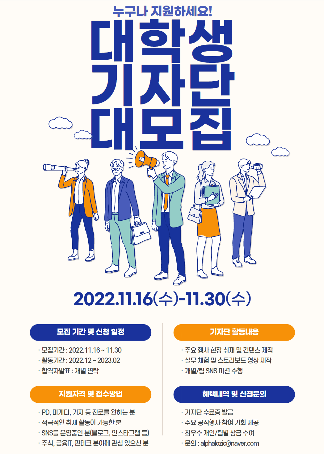 🙆♀️지원 자격 - 적극적인 콘텐츠 제작이 가능한 분 - PD\, 마케터\, 기자 등의 진로를 원하는 분 - 주식\, 금융\, IT\, 핀테크\, 재테크 분야에 관심 있는 분 - SNS를 운영 또는 운영 계획이 있는 분(블로그\, 인스타\, 유튜브 등)