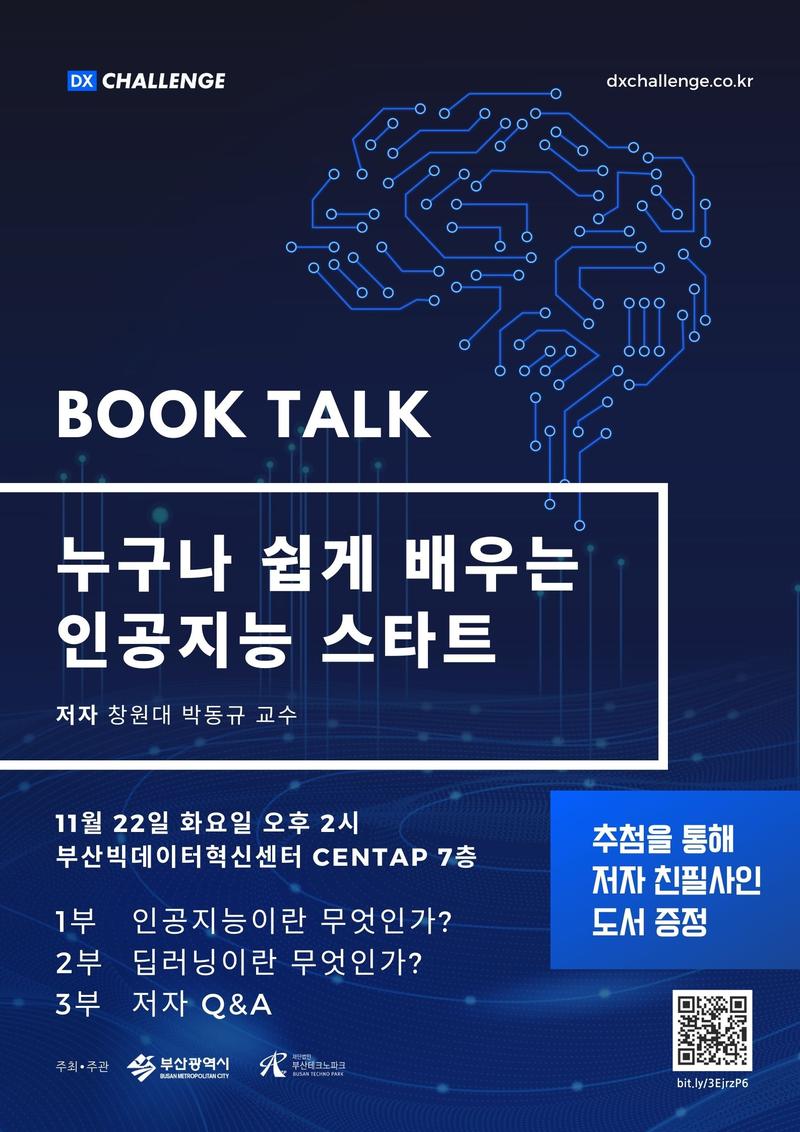 BOOK TALK - 누구나 쉽게 배우는 인공지능 스타트 인공지능과 데이터의 과거, 현재, 미래에 대해서 쉽고 재미있게 이야기를 풀어가는 북토크 4차 산업혁명으로 불리우는 현재의 산업 기술의 정점에 있는 인공지능 기술에 대하여 "누구나 쉽게 배우는 인공지능 스타트"의 저자로부터 이야기를 듣고 질문하는 북토크 행사입니다. 인공지능에 관심있는 학생이나 개발자 여러분들 중에서 "인공지능 기술이 그냥 스쳐지나가는 유행같은 기술일거야", "인공지능 기술의 속에 숨어있는 원리가 뭐야?", "내가 하고자하는 개발 업무에서 꼭 딥러닝을 알아야만 할까?" 라는 생각을 가지고 있다면 이 북토크를 통해 저자와 함께 이야기를 나누어 봅시다.