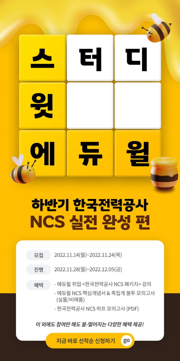 스터디 윗 에듀윌🍯 한전 NCS 실전완성편 모집 (\~11/24, 목) 합격자수 2,557% 수직증가! 1위 에듀윌 취업과 함께 한전 NCS 실전 완성하고 2022년 하반기 취업해요! 💙스터디 진행 기간 ① 모집: 2022.11.14(월)\~2022.11.24(목) ② 발표: 제출해 주신 연락처로 상시 합격 안내 및 오픈채팅방 입장 안내 예정 ③ 진행: 2022.12.05(월)\~2022.12.09(금)