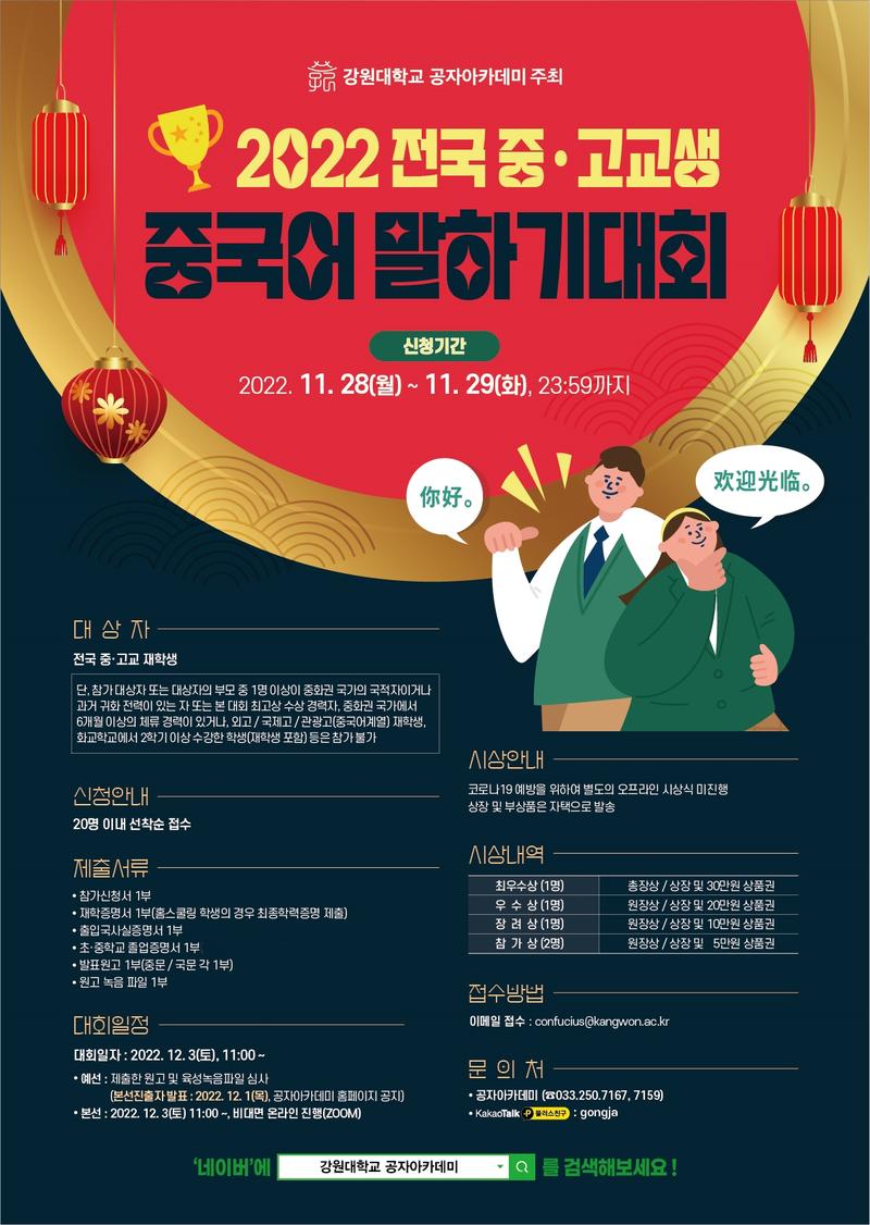강원대학교 공자아카데미에서는 학생들의 중국어 능력향상과 중국문화에 대한 보다 폭넓은 이해를 증진시키고자 다음과 같이 전국 중·고교생 중국어 말하기 대회를 개최하고자 합니다. 가. 행 사 명 : 전국 중·고교생 중국어 말하기대회 나. 신청기간 : 2022. 11. 28.(월) \~ 11. 29.(화), 23:59까지 다. 참가인원 : 20명 이내(선착순 접수) 라. 접수방법 : 이메일 접수(confucius@kangwon.ac.kr) 마. 본선 진출자 발표 : 2022. 12. 01.(목), 공자아카데미 홈페이지 공지 바. 본선대회 : 2022. 12. 03.(토), 11:00 \~ (비대면 온라인 ZOOM 진행) 사. 발표주제(택 1) 1. 青春期的烦恼 사춘기의 고민 2. 我有这样一个朋友 내게는 이런 친구가 있다 3. 我期待的未来 내가 기대하는 미래 아. 시상내역 : 최우수(총장상) 1명, 우수(원장상) 1명, 장려(원장상) 1명, 참가상(원장상) 2명 ※ 코로나19 확산방지를 위하여 별도의 시상식은 진행하지 않음 자. 문 의 처 : 강원대학교 공자아카데미 ☎033-250-7167, 7159 붙임 1. 2022 중·고교생 중국어 말하기 대회 개최 안내문 1부. 2. 포스터 1부. 끝.