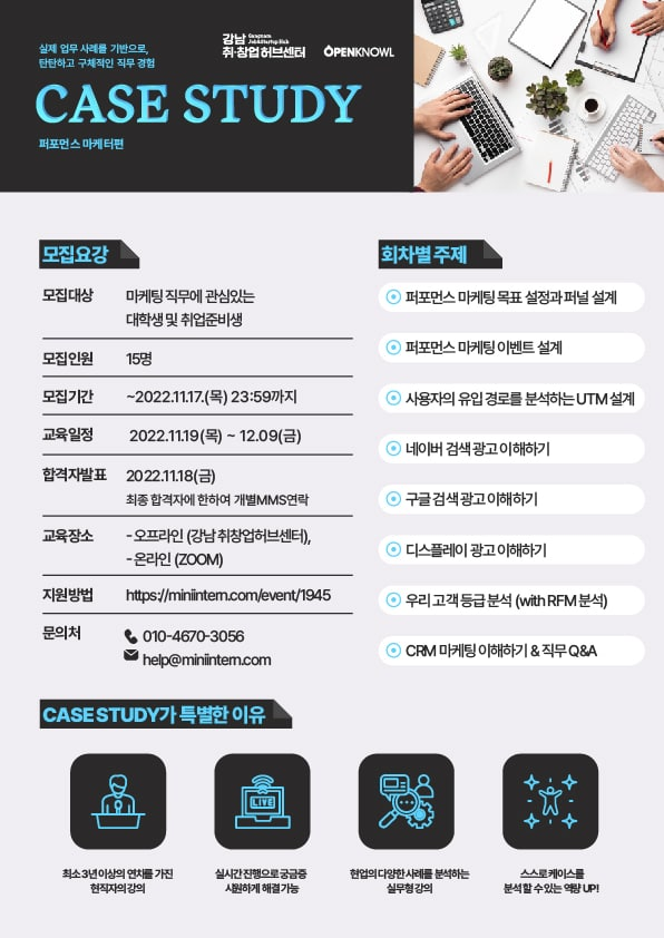 - 케이스 스터디 퍼포먼스 마케터- 퍼포먼스 마케터 직무를 희망하는 청년들을 위한 올해의 마지막 기회 현직 마케터가 직접 알려주는 퍼포먼스 마케팅 사례와 직무 스킬까지 오늘 바로 지원하세요! - 모집 대상 : 퍼포먼스 마케터 취업을 희망하는 만 15세 \~ 만39세 - 모집 일정 : \~ 11월 17일(목) 23:59까지 - 선발 발표 : 11월 18일(목)(합격자에 한해 개별 연락) - 일정 및 장소 : 총 8회(온/오프라인 병행) - 모집 링크 : https://miniintern.com/event/1945