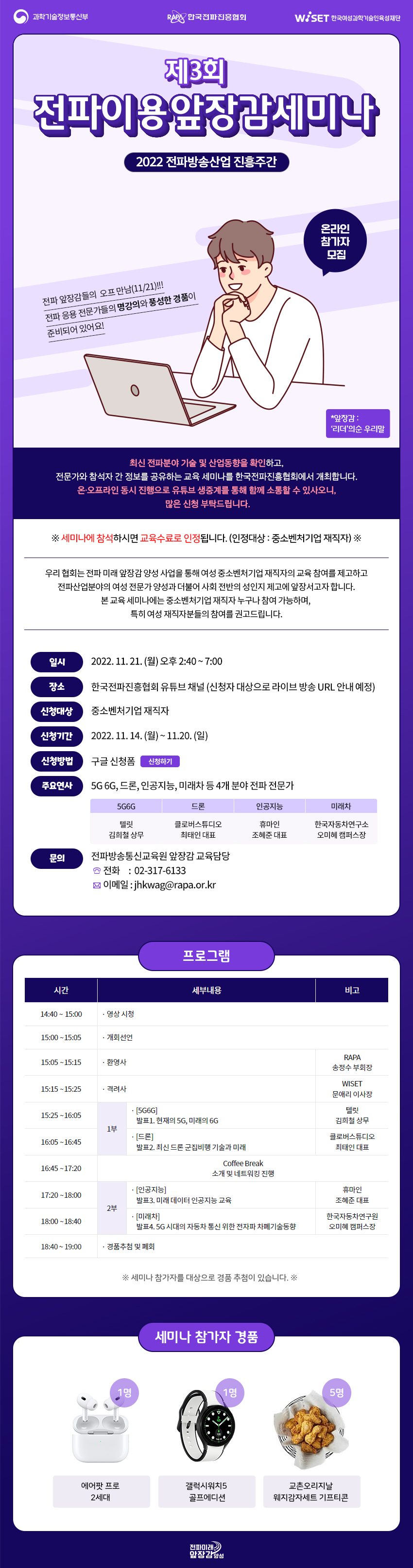 ■ 행사 개요 1. 요약 : 제3회 ‘전파이용앞장감세미나’는「2022 전파방송산업진흥주간행사*(‘22.11.21\~25) 일환으로, 최신 전파분야 기술 및 산업동향을 확인하고, 참석자간 정보를 공유하는 교육 세미나.