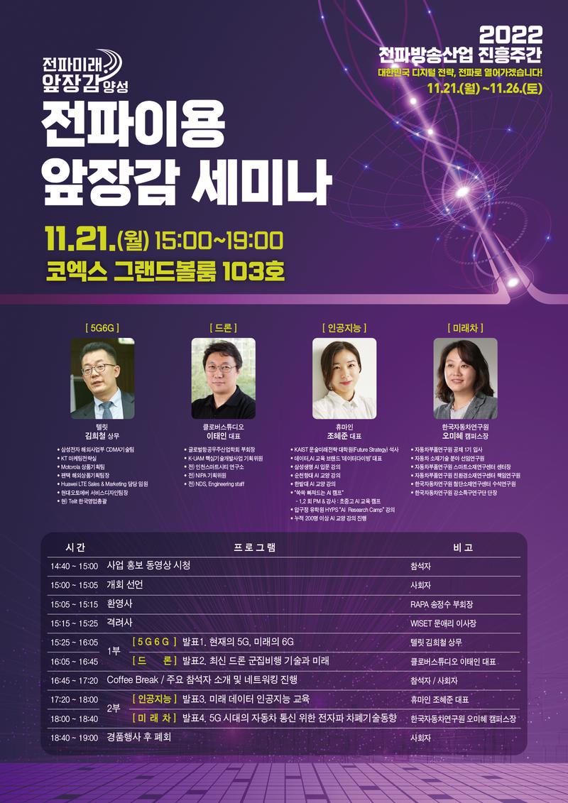 6. 프로그램 : [5G6G] 발표1. 현재의 5G, 미래의 6G(텔릿 김희철 상무) [드론] 발표2. 최신 드론 군집비행 기술과 미래(클로버스튜디오 최태인 대표) [인공지능] 발표3. 미래 데이터 인공지능 교육(휴마인 조혜준 대표) [미래차] 발표4. 5G 시대의 자동차 통신 위한 전자파 차폐기술동향(한국자동차연구원 오미혜 캠퍼스장)