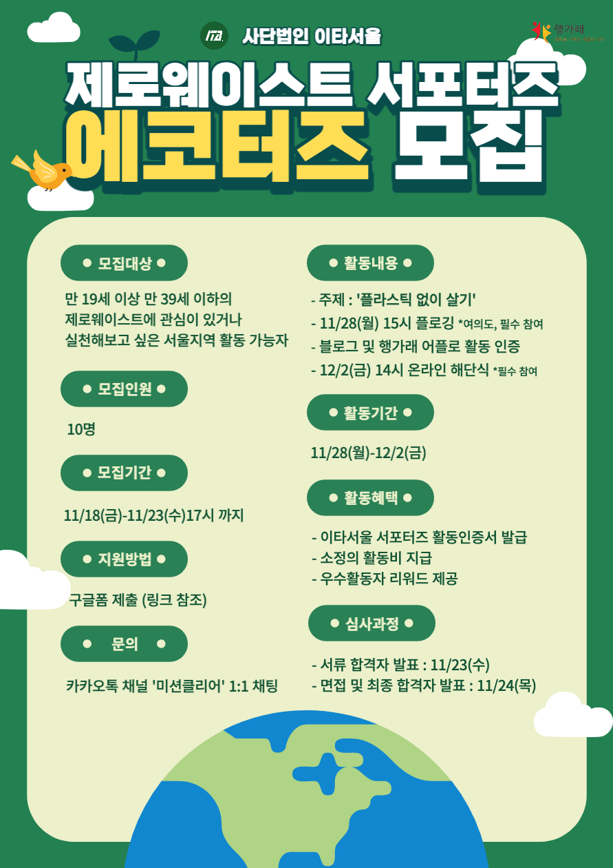 이타서울에서 제로웨이스트의 일상화를 위한 서포터즈를 모집합니다! 제로웨이스트에 관심이 많고, 실천하고 싶었지만 어떻게 하는지 모르겠다.. 어렵다.. 하는 사람 모두!! 여기 '에코터즈'에 신청해주시면 됩니다 :) 우리 모두 제로웨이스트의 '일상화'를 위해 함께 해봐요 😃 기후위기 시대를 맞아 두려운 마음을 해소하고 환경에 도움이 되고 싶은 모든 분들 환영합니다! 다른 청년분들과 함께 지구와 환경 그리고 나를 위해 활동하는 '에코터즈'에 많은 관심과 지원 부탁드립니다:) [모집절차] - 모집인원 : 10명 - 모집대상 : 제로웨이스트에 관심이 있거나 실천 해보고 싶은 청년 누구나 1) 만 19세 이상 만 39세 이하 (03년생 \~ 83년생) 2) 서울지역 활동 가능자 - 모집기간 : 11월 18일 (금) \~ 11월 23일 (수) 17시까지 - 서류합격자 발표 : 11월 23일 (수) - 면접 및 합격자 발표 : 11월 24일 (목) - 활동기간 : 11월 28일 (월) \~ 12월 2일 (금) (*5일 간 진행) - 활동장소 : 서울 전 지역 [필수 활동내용] ✅ 1. 플라스틱 없이 생활하기 - 추후 가이드라인 제공 예정 ✅ 2. 11/28(월) SK C&C 사회공헌 팀과 함께하는 데이터 플로깅 필수 참석 가) 일시: 11/28(월) 15시 \~ 16시 30분 나) 장소: 여의도 샛강공원 다) 봉사인증시간 제공 ✅ 3. 블로그 업로드 및 행가래 어플로 인증 ✅ 4. 해단식 가) 일시: 12/2(금) 14\~15시 (*시간 변동 가능) 나) 장소: 온라인 (추후 링크 전송) 🎁 활동혜택 🎁 1) 활동비 지급 2) 이타서울 서포터즈 활동인증서 발급 3) 우수활동자에게 '아로마티카 제품' 리워드 제공 [지원방법] 구글 폼 제출 🔥🔥🔥 필수 확인 사항 🔥🔥🔥 1. 1차\, 2차(12/12 시작) 에코터즈 활동에 모두 참여하는 분께는 SK C&C 서포터즈 인증서 발급 됩니다. 2. 면접과 합격자 발표가 같은 날 진행되며\, 서포터즈 관련 설명도 있을 예정입니다. 3. 활동 후\, 활동비 지급을 위해 신분증 및 통장 사본을 요청 드릴 예정입니다. 4. 서포터즈 활동 기간 동안 카카오톡 오픈채팅방을 통해서 소통할 예정이며\, 추후 링크 전달드리겠습니다. 📞문의 - 070-8015-4141\, 이타서울 (10:00 \~ 17:00) - 카카오채널 "미션클리어" 1:1 채팅 (10:00 \~ 17:00) http://pf.kakao.com/_JhNIs**