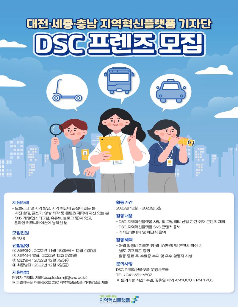 ● 활동기간 : 2022년 12월 \~ 2023년 3월 ● 제출서류 : 첨부파일 첨부 ● 제출방법 : 이메일(dscplatformjj@cnu.ac.kr) 제출 ● 결과발표 : 홈페이지 공지 및 개별 연락 ※ 자세한 사항은 첨부파일을 확인하여 주시기 바랍니다. ※ 문의처 : DSC 지역혁신플랫폼 운영사무국 ☎041-631-6802