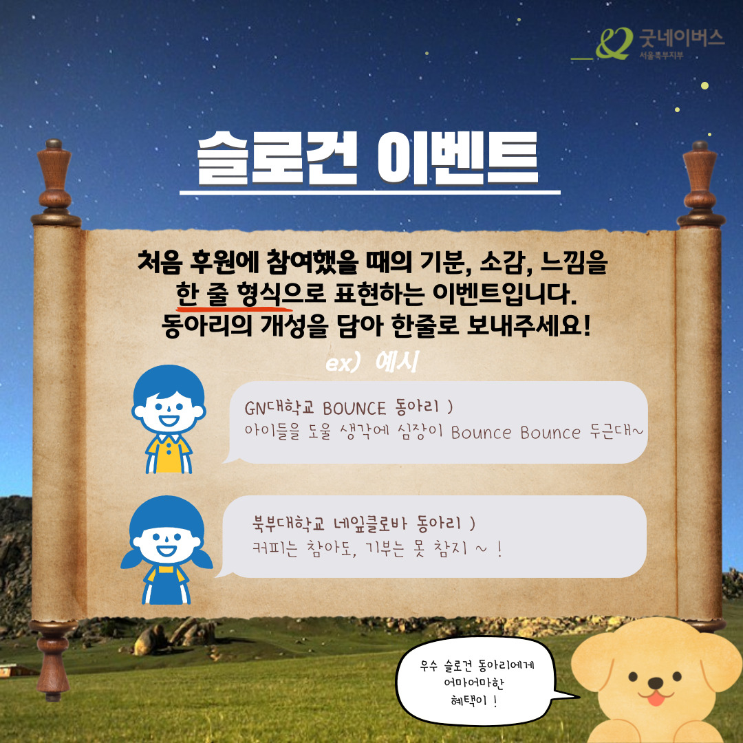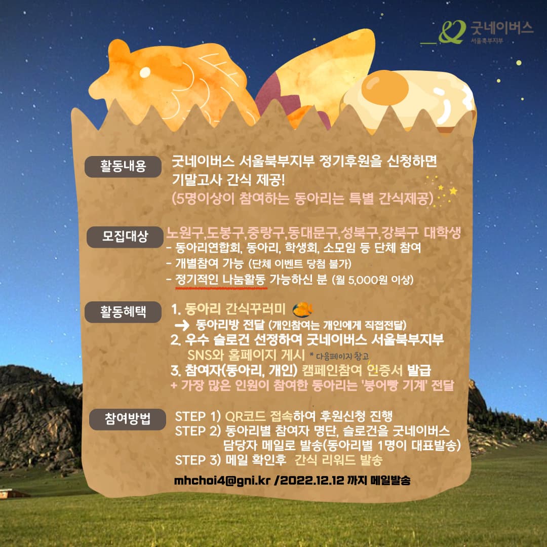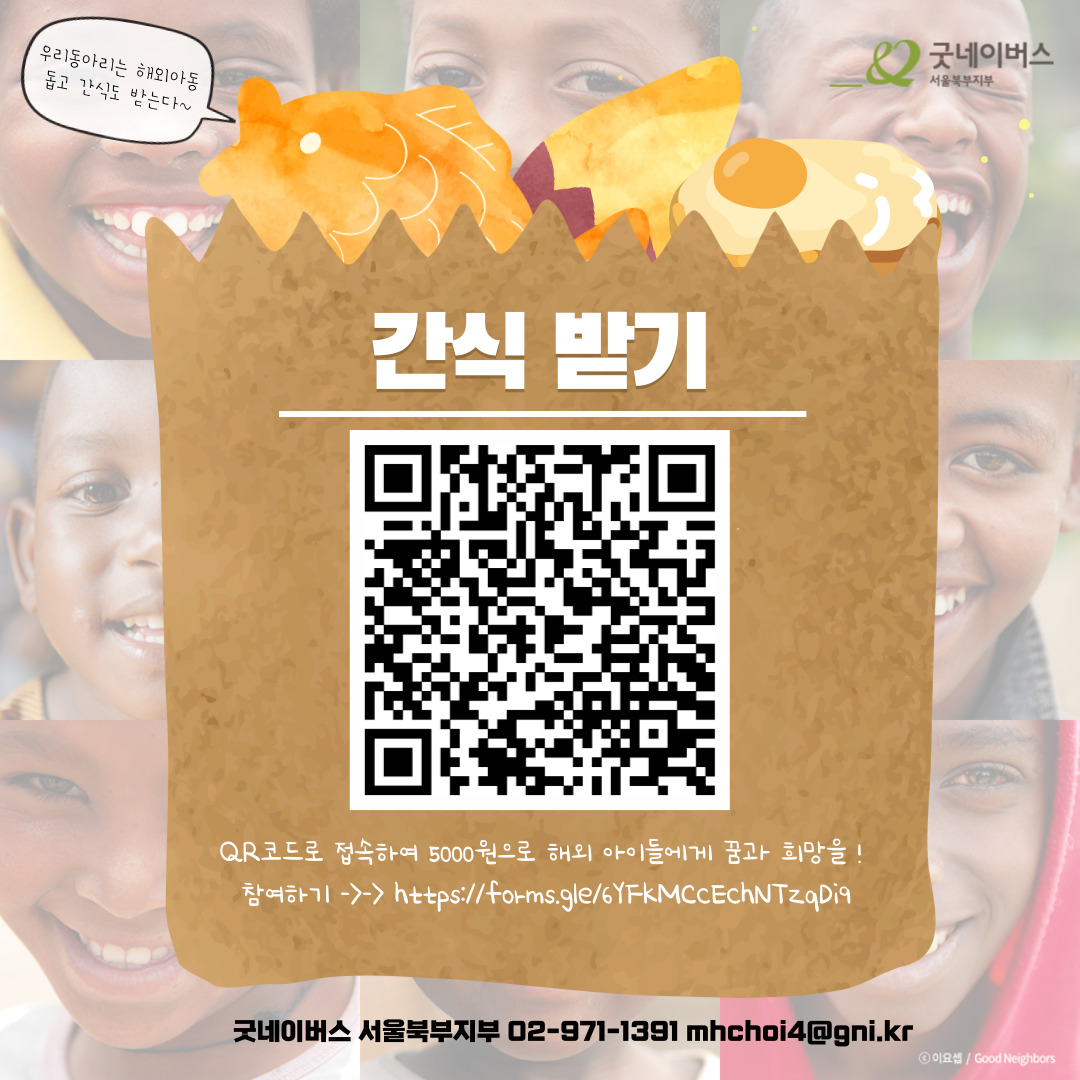❤︎참여기간: 2022.11.16. \~ 2022.12.12. ❤︎활동내용: 정기후원을 신청하면 기말고사 간식 제공 (5명이상 참여하는 동아리는 특별 간식제공) ❤︎모집대상 : 노원구,도봉구,중랑구, 동대문구, 성북구, 강북구 대학생 -동아리연합회, 동아리, 학생회, 소모임 등 단체 참여 -개별인원도 참여가능 (단체 이벤트는 참여 불가함->5명이상 후원 붕어빵기계x) -정기적인 나눔활동 가능하신 분(월5,000원 이상) ❤︎활동혜택: 1.간식꾸러미->단체는 동아리방 전달/개인참여는 개인에게 직접전달 2.우수 슬로건 선정하여 굿네이버스 서울북부지부 SNS와 홈페이지 게시*간식 배포시 스티커 부착 3.참여자(동아리,개인)캠페인참여 인증서 발급 +가장 많은 인원이 참여한 동아리는 '붕어빵 기계'전달 ❤︎참여방법: STEP1)QR코드 접속하여 후원신청 진행https://forms.gle/6YFkMCcEchNTzqDi9 STEP2)동아리별 참여자 명단,슬로건을 굿네이버스 담당자 메일로 발송 (동아리별 1명이 대표발송) STEP3)메일 확인후 간식 리워드 발송 ❤︎공지사항: -캠페인 지원 시 개인정보 취급 및 관히라는 것에 동의한 것으로 간주됩니다. -제공된 개인 정보는 본 목적 외에 어떠한 용도로도 사용되지 않으며 캠페인 종료 후 파기됩니다. -캠페인 참여 후 개인정보 오기입 등의 이유로 연락이 되지 않을 경우 참여 신청이 자동으로 무효 처리되며 이에 따른 책임은 본인에게 있습니다. -해당 캠페인은 굿네이버스 서울북부지부에서 주관하는 캠페인으로 개별적으로 굿네이버스 홈페이지를 통해 신청한 후원과 이미 진행중인 후원은 인정되지 않습니다. 반드시 QR코드로 통한 신청만 가능합니다. -캠페인 참여 해택은 2022.12.12이후 순차적으로 전달됩니다.