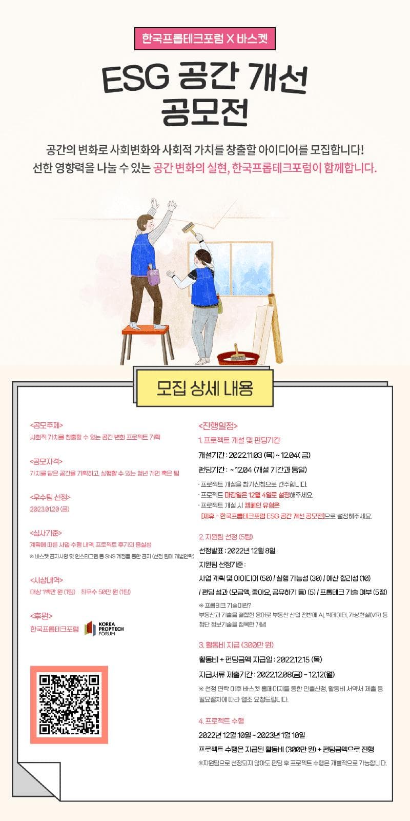 ● 주제 한국프롭테크포럼은 공간의 변화로 사회변화와 사회적가치를 창출할 아이디어를 모집합니다. ESG의 의미를 담아 공간의 사회공헌적 가치를 높이는 공간 개선 아이디어를 응원하고 모집합니다. ● 자격 가치를 담은 공간을 기획하고, 실행할 수 있는 청년 개인 혹은 팀 ● 모집인원 5팀/개인 선정 ● 기간 및 일정 1. 모집기간 프로젝트 개설 기간 : 2022. 11. 03 (목) \~ 12. 04 (금) 프로젝트 펀딩 기간 : \~ 12. 04 (금) (개설기간과 동일) 2. 활동기간 프로젝트 수행 : 2022. 12. 10. (토) \~ 23. 01. 10.(화) ● 모집방법 Step1. ‘공간’을 변화시켜 사회적 가치를 창출할 아이디어 기획 Step2. [홈페이지 신청] 개인모금플랫폼 바스켓에서 프로젝트 개설(메이크)하면 참가 완료! 프로젝트 개설 예시 : https://basket.fund/bascat/3 ● 활동내용 - 사회적 가치를 창출할 수 있는 공간 변화 프로젝트 기획 (\~12/4) - 프로젝트 캠페인 모금 및 홍보(\~12/4 금) - 프로젝트 수행(12/10 토 \~ 23/1/10 화) - 프로젝트 결과 공유 및 보고(23/1/15 일)