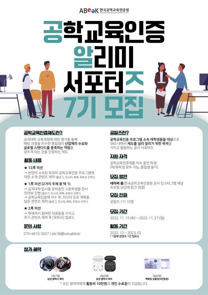 공알즈가 어느새 7기로 돌아왔습니다. 공학교육인증제에 대해 적극적으로 알려주실 공알즈 7기를 모집합니다.