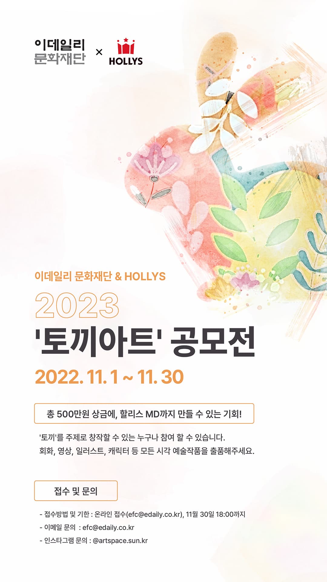 <공모개요> ○ 공 모 명 : 이데일리문화재단 ‘2023 토끼아트 공모전’ with 할리스 ○ 공모분야 : 희망찬 새해를 염원하며 행복과 번영을 상징하는 2023 계묘년 ‘토끼’를 테마로 하는 모든 시각 예술 창작물 (회화, 영상, 일러스트, 캐릭터 등 모든 시각예술 작품) ○ 참가대상 : 본인 창작물로 전시가 가능한 창작자 누구나 ○ 공모기간 : 2022. 11. 1.(화) \~ 11. 30.(수), 1개월 ○ 결과발표 : 2022. 12. 9.(금) 예정 / 이데일리문화재단 홈페이지 공지 및 수상자 개별통보 ○ 주 최 : 이데일리문화재단 ○ 협 찬 : KG할리스에프앤비