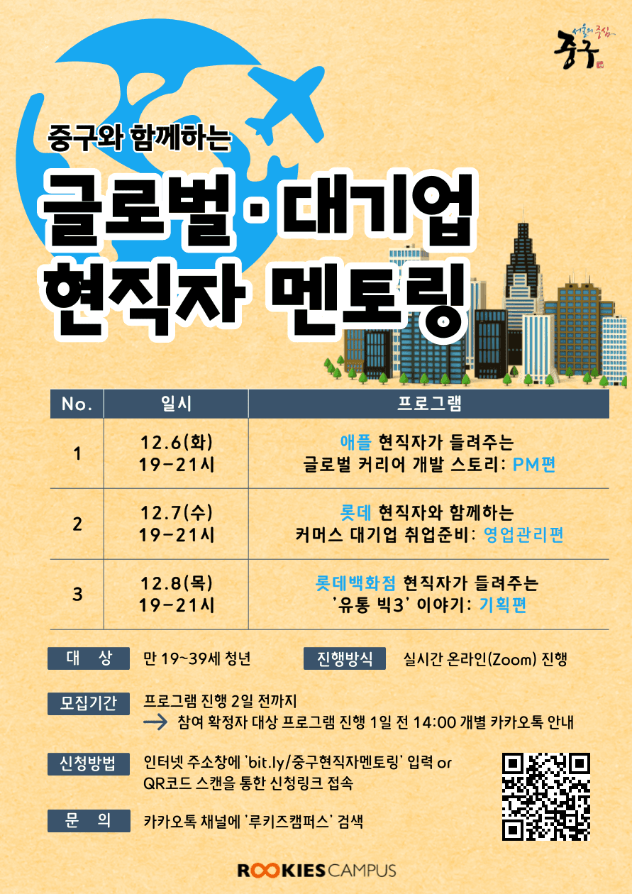 글로벌 & 대기업 취업에 관심있는 학생들을 위한 12월 현직자 멘토링! 국내·외 TOP 기업 현직자가 직접 참여하는 이번 멘토링은 유통·커머스·IT 분야에 대한 이야기에 더해 영업관리, 기획, PM 직무 맞춤 취업준비 Tip까지 알려드릴 예정입니다.
