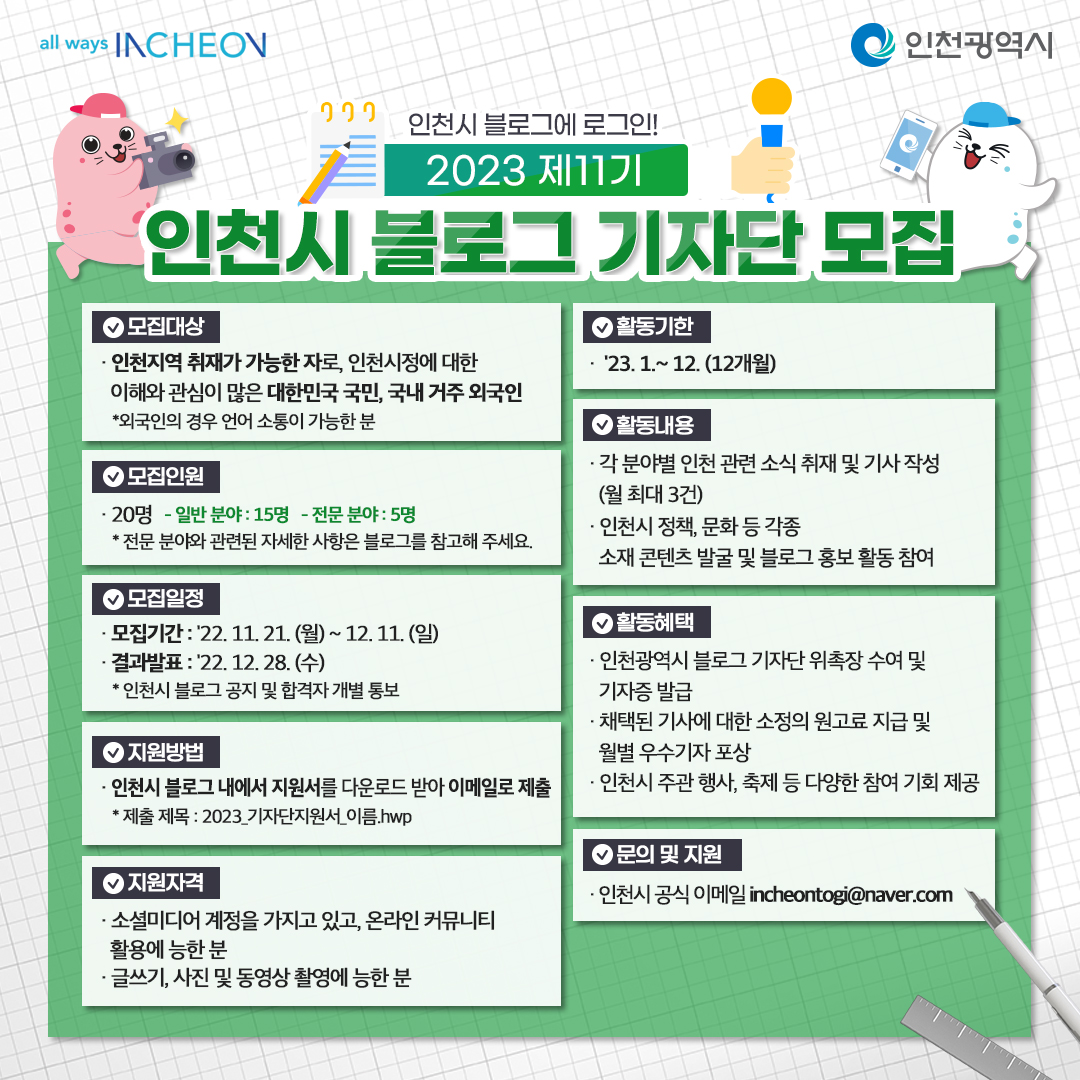 [지원 자격] - (공통) 글쓰기에 관심이 많으며\, 사진촬영에 능하고\, 소셜미디어 운영에 활발한 사람 - (내국인) 20세 이상의 인천을 사랑하는 전 국민 - (외국인) 20세 이상의 국내 거주 외국인으로 언어 소통 가능한 자