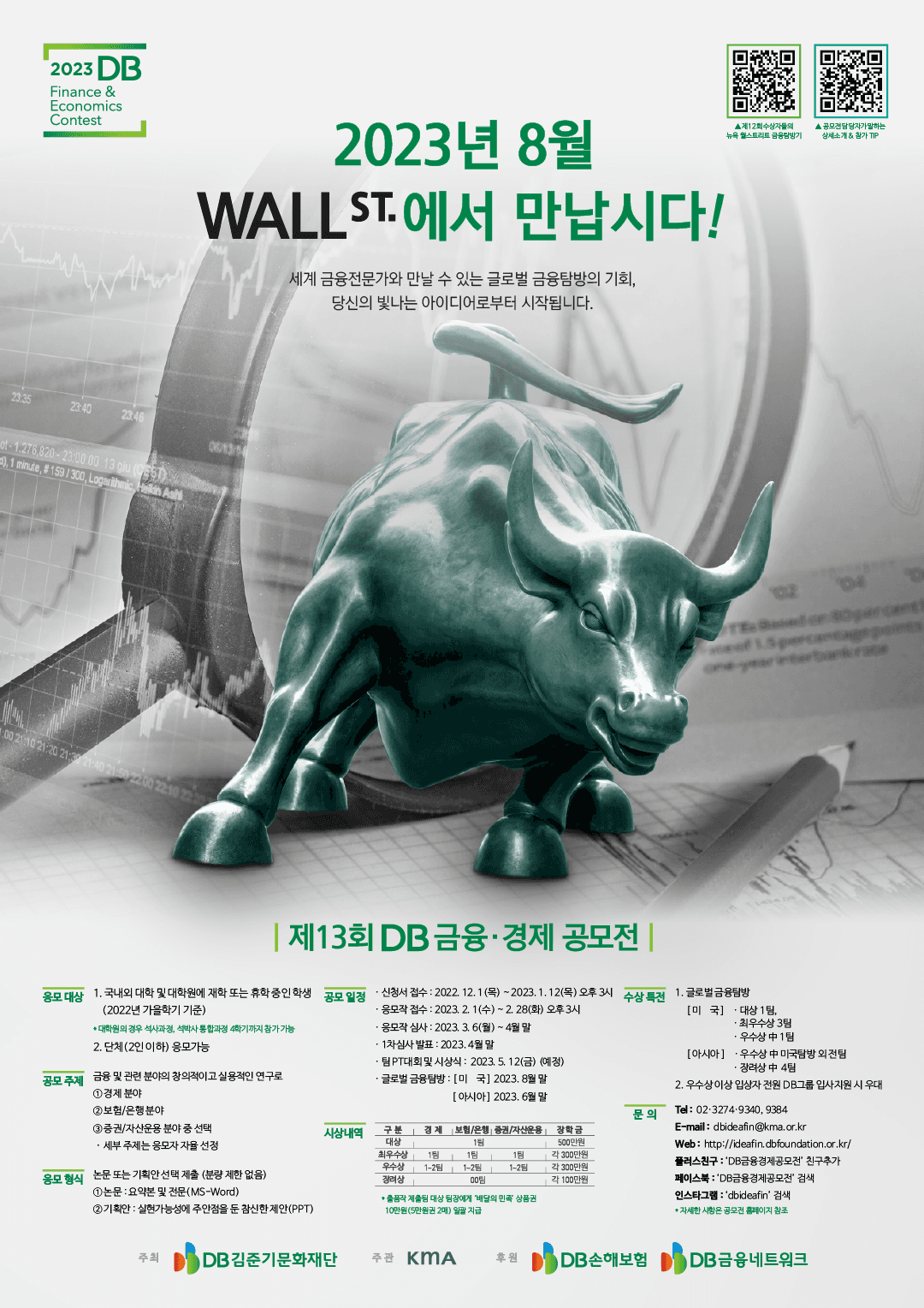 🌟제13회 DB금융·경제 공모전이 개최되었습니다!🌟 DB김준기문화재단이 주최하는 DB금융·경제 공모전은 대학생들의 ‘금융에 대한 관심 제고’와 ‘미래 금융 전문가 육성’ 을 위해 2010년부터 매년 개최되고 있으며 어느덧 13회를 개최하였습니다. 올해로 열세번째를 맞는 DB 금융·경제 공모전에서는 멋진 금융인으로 성장할 대학생 여러분의 도전을 기다리고 있습니다. 세계 금융전문가와 만날 수 잇는 글로벌 금융탐방의 기회, 당신의 빛나는 아이디어로부터 시작됩니다! ■ 응모 대상 1. 국내외 대학 및 대학원에 재학 또는 휴학 중인 학생 (2022년 가을학기 기준) *대학원의 경우 석사과정, 석박사 통합과정 4학기까지 참가 가능 2. 단체(2인 이하) 응모 가능 ■ 공모 주제 금융 및 관련 분야의 창의적이고 실용적인 연구로