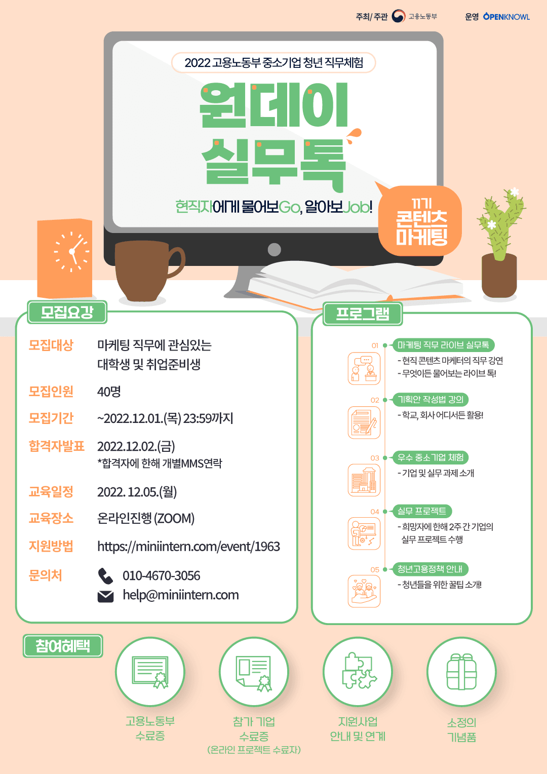 ▷활동혜택 - 고용노동부 수료증(1일 교육 수료자 대상) - 참가 기업 수료증(실무 프로젝트 수료자) - 콘텐츠 마케팅 실무 프로젝트 경험 - 청년 지원 사업 안내 및 연계 - 소정의 기념품