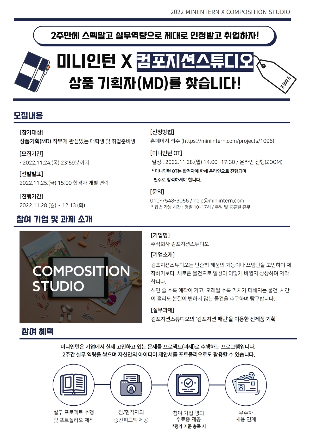▶ 모집 기간 \~2022.11.24.(목) 23:59까지 ▶ 프로그램 선발 발표 \~2022.11.25.(금) 15:00 *합격자에 한하여 개별 문자 연락 ▶ 모집 대상 - 상품 기획(MD) 직무에 관심이 있는 분 - 상품 기획(MD) 실무 경험을 쌓고 싶으신 분 - 이론이 아닌\, 실무 지식을 얻고 싶으신 분 - 기업의 실무 프로젝트를 통한 포트폴리오 제작을 원하시는 분 ▶ 과제 수행 기간 - 2022.11.28. (월) \~ 2022.12.13. (화) ▶ 미니인턴 OT 일정 (필수참여) - 일시: 2022.11.28.(월) 14:00 \~ 17:30 - 장소: 온라인 (ZOOM) ▶ 미니인턴 OT 교육 내용 - 미니인턴 오리엔테이션 - 기업 소개 및 과제 안내 - 기획안 작성법 교육 - Q&A 및 마무리 ▶ 개별 과제 소개 (OT 후 2주간) 컴포지션스튜디오의 '컴포지션 패턴'을 이용한 신제품 기획 ▶참가 혜택 - 직무 역량 강화 교육 무료 진행 - N년 차 전/현직자의 중간피드백 무료 제공 - 수료 시\, 참여 기업명의 수료증 발급 - 우수자 채용연계