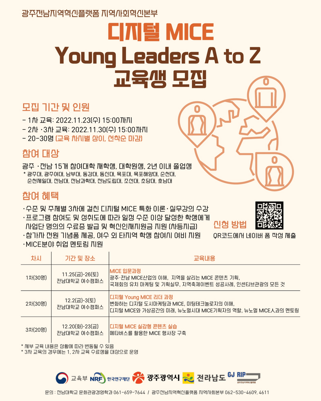 지역사회혁신본부에서 광주·전남(여수) 지역의 핵심 분야인 관광·MICE산업에 대한 관심 제고와 역량 강화 및 MICE 산업 인재 양성을 위한 이론·실습 프로그램 교육생을 모집합니다. ○ 모집내용 - 모집인원 : 20\~30명 - 모집기간 : (1차 교육) 2022.11.23.(수) 15:00까지 (2·3차 교육) 2022.11.30.(수) 15:00까지 - 모집대상 : 광주·전남 15개 참여대학 재학생, 대학원생, 2년 이내 졸업생 ※ 광주∙전남권 소재 대학 (15교) - 광주권(7): 광주대, 광주여대, 남부대, 동강대, 전남대, 조선대, 호남대 - 전남권(8): 동신대, 목포대, 목포해양대, 순천대, 순천제일대, 전남과학대, 전남도립대, 초당대 ○ 진행일정 레벨 및 주제별 3차에 걸친 오프라인 교육 진행 (1차) MICE 입문과정 : 2022.11.25.(금) \~ 12.26.(토) (2차) 디지털 Young MICE 리더 과정 : 12.02.(금) \~ 12.03.(토) (3차) 디지털 MICE 실감형 콘텐츠 실습 과정(메타버스 실습) : 12.20.(화) \~ 12.23.(금) 장소 : 전남대학교 여수캠퍼스 ※교육 프로그램은 차수별 개별 신청 가능하나, 3차 디지털 MICE 실감형 콘텐츠 실습과정은 1차 및 2차 교육 수료생에 한하여 신청 가능 ○ 참여혜택 - 수준 및 주제별 3차에 걸친 디지털 MICE 특화 이론·실무강의 수강 - 프로그램 참여도 및 성취도에 따라 일정 수준 이상 달성 시 수료증 발급 및 혁신인재지원금 지급(차등지급) - 참가자 전원 기념품 제공\, 여수 외 타지역 학생 참여시 여비 지원 - MICE분야 취업 멘토링 지원 ○ 신청방법 - 포스터 QR코드에서 네이버 폼 작성 제출 - 네이버 폼 : https://naver.me/F3oDT4ot