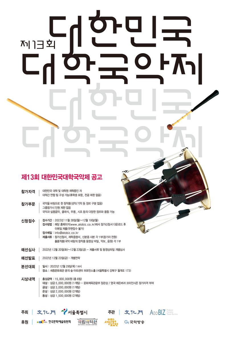 ▢ 신청접수 • 접수기간: 2022년 11월 28일(월)\~12월 19일(월) • 접수방법: 해당 홈페이지( 바로가기 )에서 참가신청서 다운로드 후 이메일 제출(우편접수 불가) • 접수이메일: info@atobiz.co.kr · 이메일 접수시 제목에 '제13회 대한민국대학국악제 신청-신청자명' 기입 • 제출서류: · 참가신청서 1부 · 참가자 전원의 재학증명서, 신분증 사본 각 1부 · 출품작품(국악 바탕의 창작품 동영상 파일, 악보, 음원) 각 1부 ※ 동영상은 이메일 대용량 파일 첨부, 웹하드, 드롭박스 또는 유튜브, 비메오 링크 공유 가능