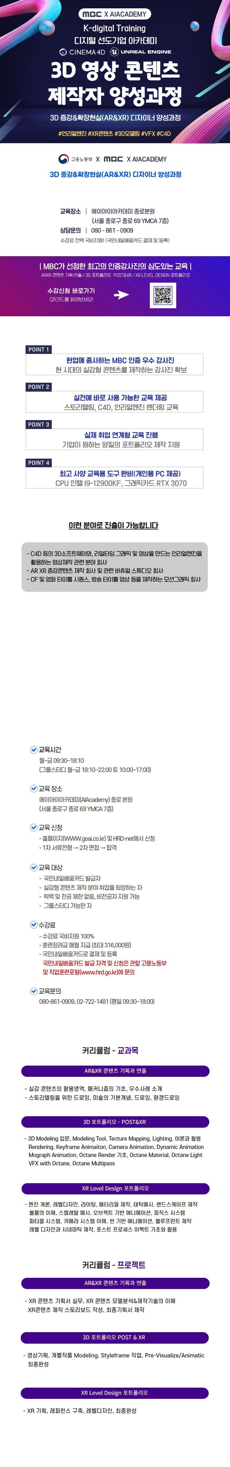 고용노동부와 MBC x AIAcademy가 개설하는 3D 영상 콘텐츠 제작자 양성 강의 해당 과정은 MBC와 AIAcademy 협력 지원 과정으로 빠르게 발전하는 3D 영상 업계에 힘을 더해줄 교육생 양성을 목표로 하는 과정입니다. *국민내일배움카드 발급자 대상으로 진행되는 국비 지원(무료) 교육 입니다. * 강의 정보 1. 강의명 : 3D 영상 콘텐츠 제작자 양성 과정 - 국민내일배움카드 발급자 대상으로 진행되는 국비 지원(무료) 교육 입니다. 2. 강의기관명 : MBC x AIAcademy 3. 교육 장소 : 에이아이아카데미 종로 본원 (구 비트캠프 종로센터) / MBC 4. 대상자 : 본인의 스토리를 3D 영상으로 풀어내고 싶은 대한민국 국적 취업준비생 및 구직자 5. 공식 홈페이지 https://bit.ly/3DyP5Yf 6. 공식 메타버스 맵 https://mbcaia.ovice.in/ 7. 모집 기간 : 현재 \~ 2022.12.05 (월) 8. 강의 기간 : 4기 - 2022.11.29 \~ 2023.05.19 5기 – 2022. 12. 20 \~ 2023. 06. 12 월-금 9:30 – 18:30 (8H/960시간/6개월) 9. 강의 및 커리큘럼 기획자 인터뷰 영상 -Part1 https://www.youtube.com/watch?v=Km40kuqJANM -Part2 https://www.youtube.com/watch?v=5pe-oDMudc0 10. 문의 번호 : 080-861-0909
