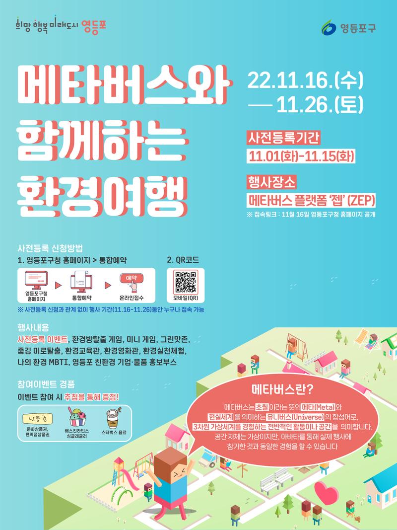 「메타버스와 함께하는 환경여행」 - 주최/주관 : 영등포구청 환경과 - 행사일시 : 2022.11.16(수) \~ 11.26(토) - 행사장소 : 온라인 메타버스 플랫폼 '젭'(ZEP)' 내 가상공간 - 주요내용 : 어디서든 즐길 수 있는 YDP 환경 역사\, 체험\, 게임\, 이벤트 운영