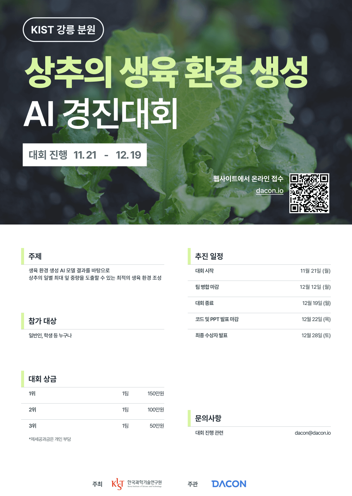 ○ 주최 / 주관 - 주최: KIST - 주관: 데이콘(dacon@dacon.io) ```