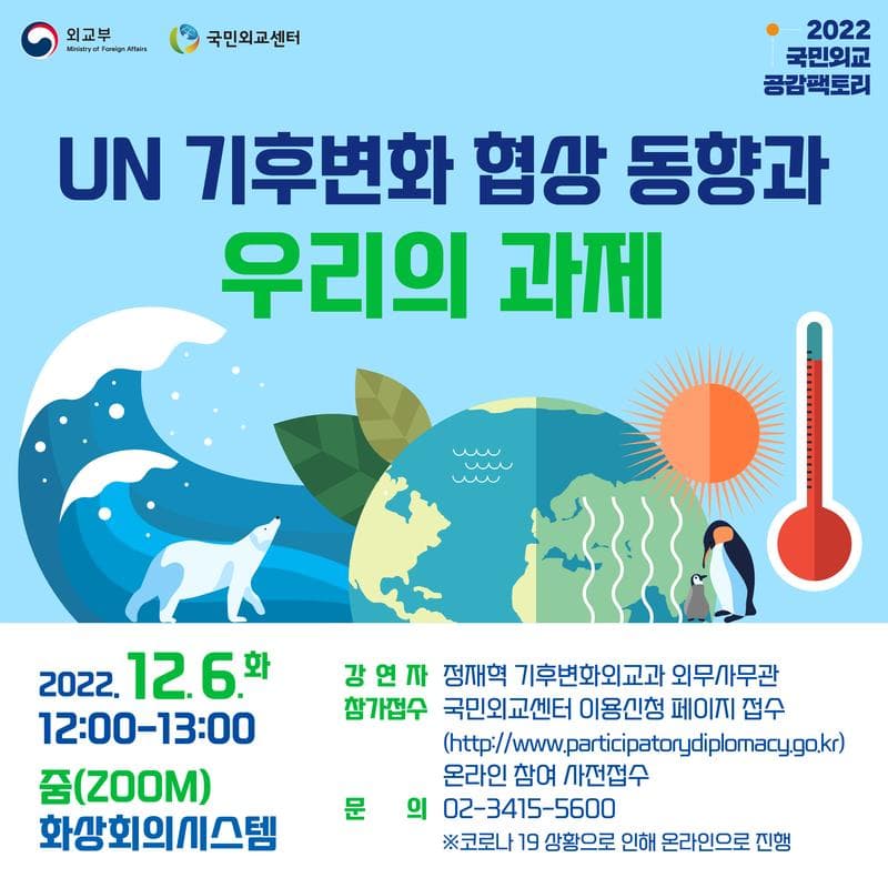 ※ 참여 국민 모집 완료 후 안내 문자를 통해 구글 폼으로 사전 질문을 받을 예정입니다. 기후변화외교와 관련된 질문을 적어주세요!