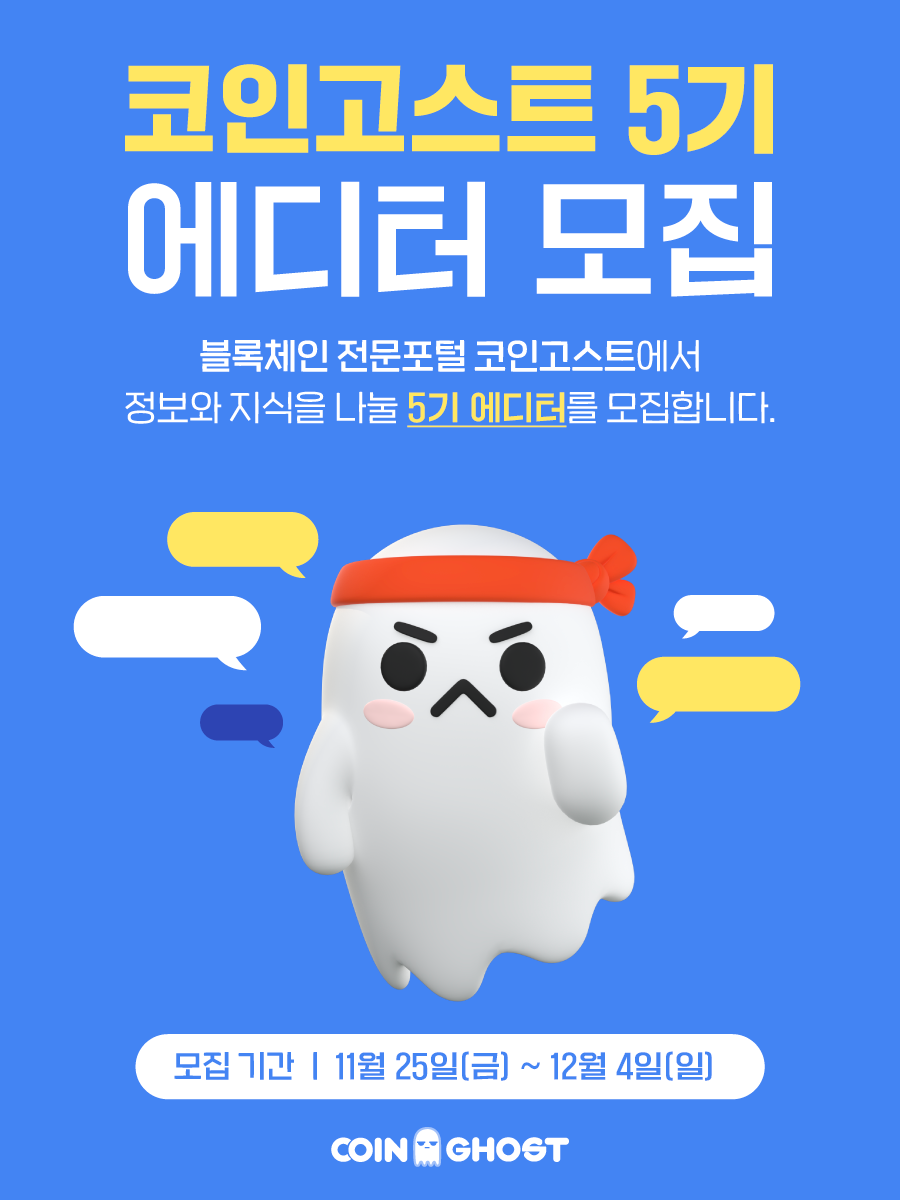 <코인고스트 5기 에디터 모집> 코인고스트에서 다양한 유저와 함께 정보를 나누고 올바른 업계 지식을 전달할 5기 에디터를 모집합니다.