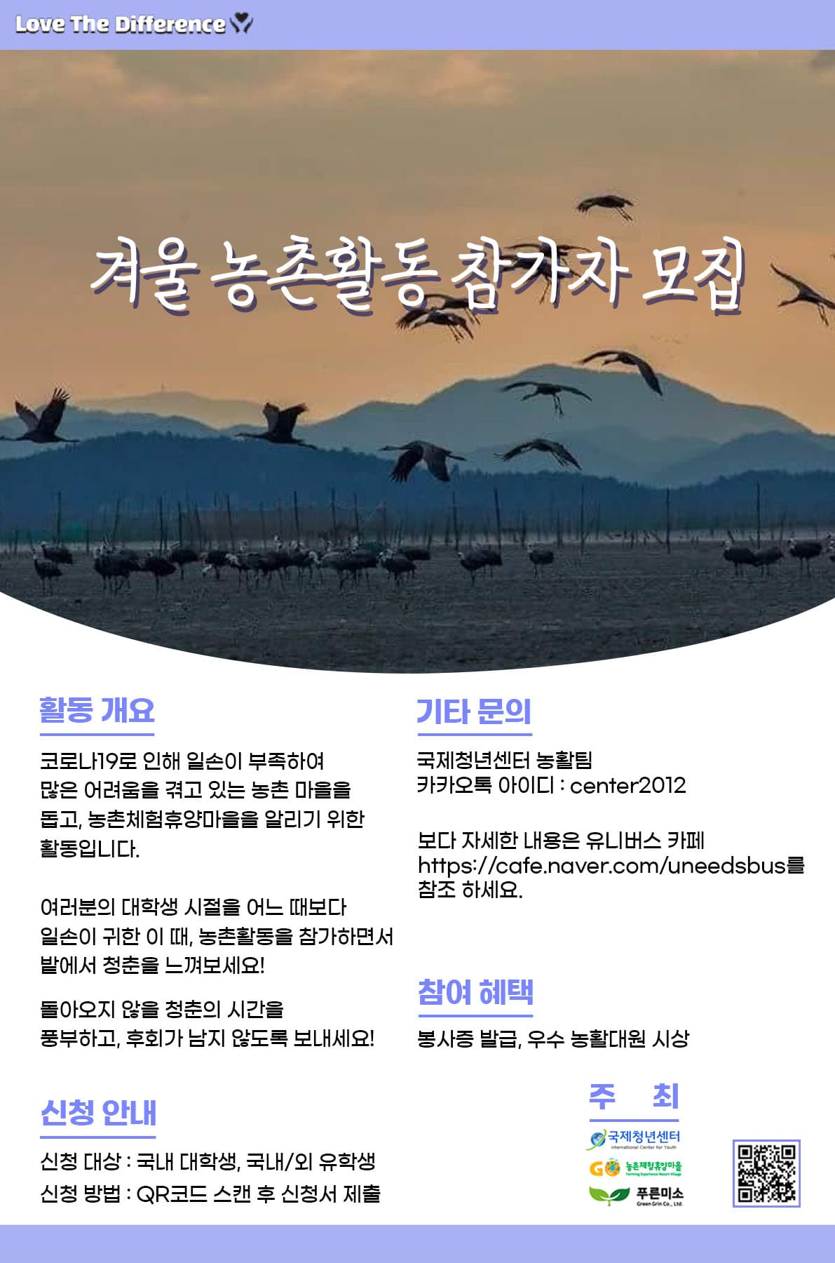 안녕하세요? 코로나19로 인해 부족한 농촌 일손을 돕기 위해 농촌활동 참가자를 모집 합니다. 농활은 대학생때만 할 수 있는 봉사활동으로 여러분의 대학 생활을 보다 뜻깊게 할 것입니다. 1. 신청 대상 : 국내 대학생\, 국내외 유학생(휴학생\, 졸업생 포함) 2. 신청 방법 : https://han.gl/IfpBW 온라인 신청서 제출 3. 모집 기간 : 각 마을 회차별 선착순 마감 4. 참가비 : 50\,000원(식자재(또는 식사) 제공\, 교통비 지원 포함) * 비대면 면접으로 최종 참가 확정 후 납부 하시면 됩니다. 5. 면접 및 오리엔테이션 - 참가 신청 하시면 각 마을 운영팀에서 개별적으로 비대면 면접 안내를 드립니다. - 최종 선발자를 위한 오리엔테이션 안내를 개별적으로 드립니다. 6. 혜택 : 1365봉사증 발급 7. 문의 : 카카오톡 아이디 center2012 보다 자세한 내용은 https://cafe.naver.com/uneedsbus/1417 를 참조 하세요.