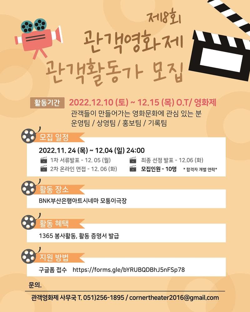 ▶️ 활동내용 및 활동기간 ▪ 활동기간 2022.12.10(토)\~12.15(목) 영화제 /O.T 12.07(수) (오리엔테이션 1회 및 영화제 6회, 총 7회 참여) ▪️ 활동장소: BNK부산은행 아트시네마 모퉁이극장 (부산 중구 광복중앙로13, 3층) ▪️ 활동분야: 운영팀 / 상영팀 / 홍보팀 / 기록팀 (신청서 내 상세내용 참고) ▪️ 활동혜택: 1365봉사활동 확인서, 활동 증명서 발급, 기념품 증정, 모퉁이극장 행사 참여 우대 ▪️ 문의: 관객영화제 사무국 051-256-1895 /cornertheater2016@gmail.com