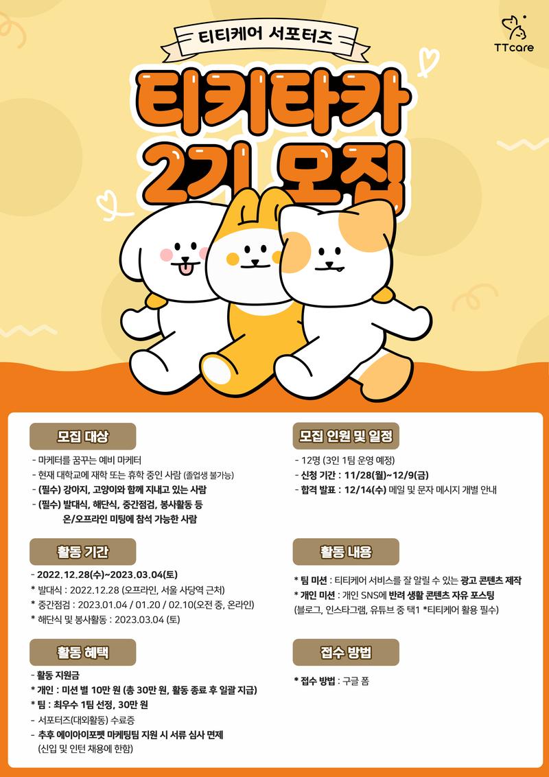 대학생 서포터즈 '티키타카' 2기를 모집합니다! 🐶🐱