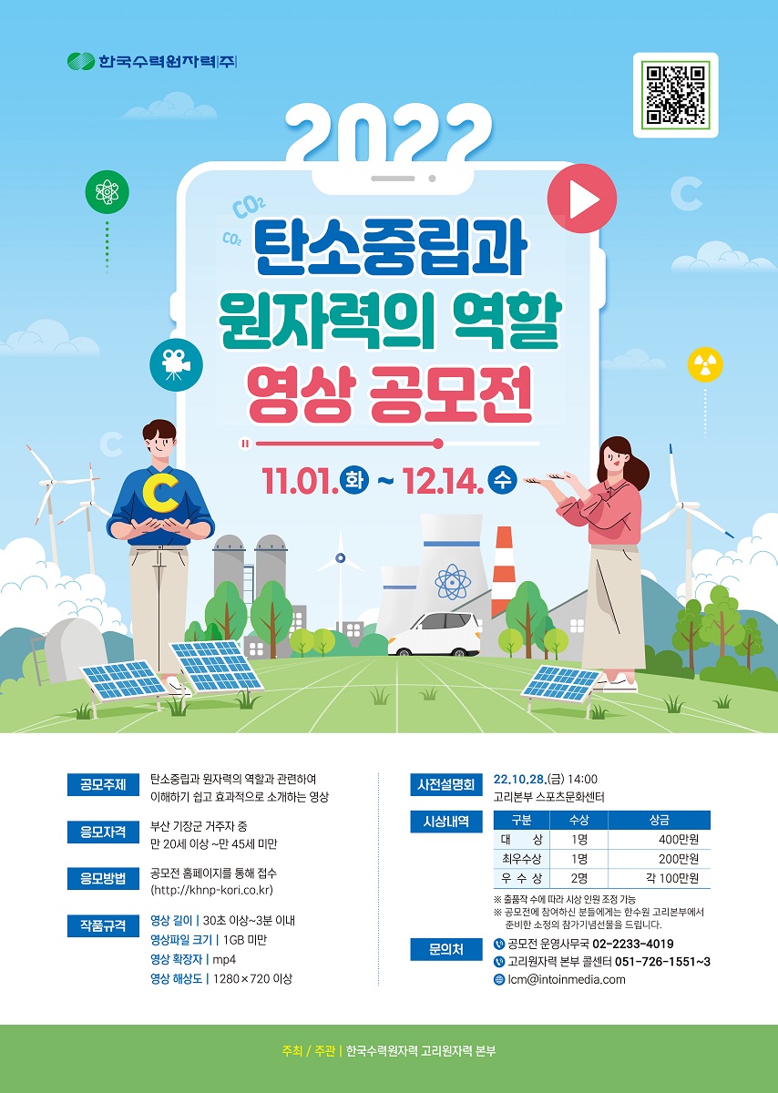 ■ 응모주제 - 탄소중립과 원자력의 역할과 관련하여 이해하기 쉽고 효과적으로 소개하는 영상 ■ 응모자격 - 부산 기장군 거주자 중 만 20세 이상\~만 45세 미만 ■ 접수방법 - 공모전 홈페이지를 통해 접수 http://khnp-kori.co.kr/ ■ 작품 규격 -영상 길이 : 30초 이상\~3분 이내 -영상 크기 : 1GB 미만 -영상 확장자 : MP4(아이폰 사용자는 공모전 홈페이지 FAQ 참고) -영상 해상도 : 1280 X 720 이상 ■ 시상내역 - 대상 - 1명, 400만원 - 최우수상 - 1명, 200만원 - 우수상 - 2명, 각 100만원 * 출품작 수에 따라 시상 인원 조정 가능 ■ 문의처 - 공모전 운영사무국 : 02-2233-4019 / lcm@intoinmedia.com - 고리원자력 본부 콜센터 : 051-726-1551\~3