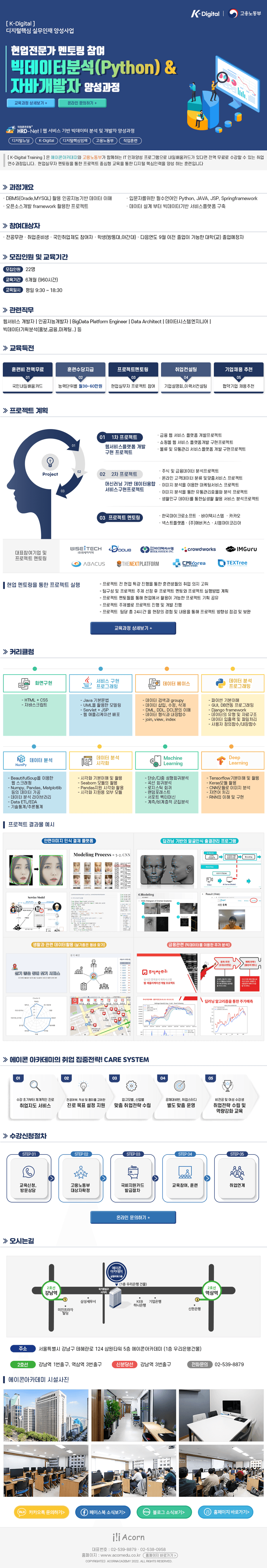 ○ 교육과정 - [K-디지털 트레이닝] 현업전문가 멘토링 빅데이터분석(파이썬) & 자바 개발자 양성과정 ○ 교육자격 - 전공무관. 취업준비생.졸업예정자.국민취업지원제도.재학생(방통대\,야간대) - 내일배움카드 발급 필수 ○ 교육일정 - 2022년12월28일 \~ 2023년06월22일 / 총960시간 ○ 교육시간 - 09:30 \~18:30 (주5일 수업\,일일8시간 ) / 중식 : 13:30\~14:30 (1시간) ○ 교육비용 - 전액 국비지원 무료(9\,140\,160원) ○ 교육수당 - 단위기간별 훈련일수의 80% 이상을 출석한 경우 월훈련장려금 지급 ○ 교육특전 - 현업 기업 실무진 멘토링 및 취업지원 ○ 교육수료 후 진로 - 빅데이터 관련기업 취업 - IT관련 대기업 취업 - IT관련 창업 ○ 교육장소 - 강남 서울특별시 강남구 테헤란로 124 삼원타워 5층 에이콘아카데미 ○ 교육문의 - 카카오톡 문의: https://acornedu.co.kr/info/sns.jsp