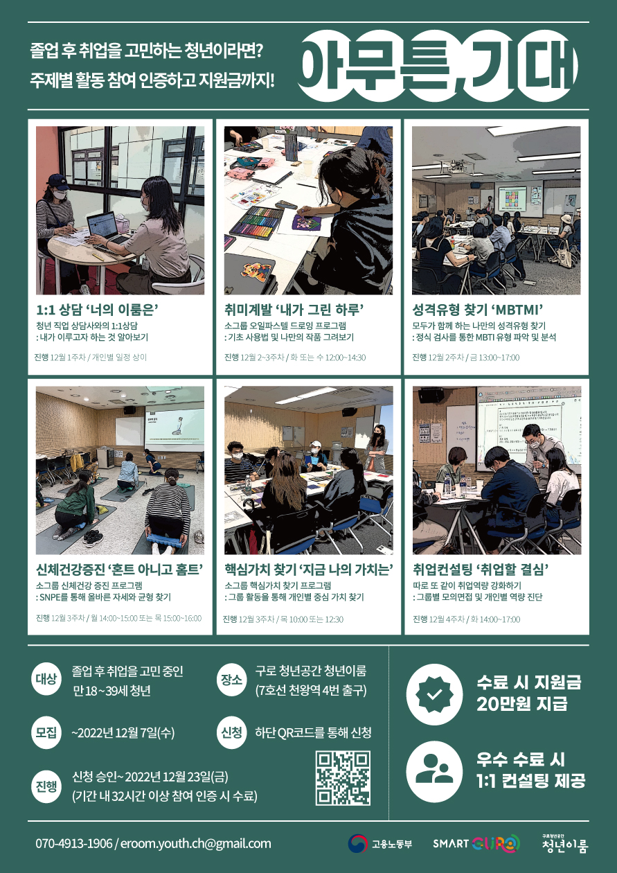 ▶ 제공/혜택 - 수료 시 도전지원금 20만원 지급 - 우수 수료자 선정 시 1:1 취업컨설팅 제공 ⠀ ▶ 모집기간 - 2022년 12월 7일(수)까지 (모집 인원 충족 시 조기 마감) ⠀ ▶ 신청방법 - 신청링크 : 프로그램 신청 바로가기 또는 포스터 내 QR코드로 접속 (온라인 신청 불가 시 아래 연락처로 문의하여 신청) - 워크넷(work.go.kr) 신청 시 신청기관을 '서울-구로 청년이룸(서울 구로구)'로 선택 (신청 완료 후 1\~2일 이내에 유선 및 문자 등을 통해 개별 연락) ⠀ ▶ 문의 - 전화 : 070-4913-1906(운영팀) / 070-4913-3809(상담팀) - 메일 : eroom.youth.ch@gmail.com - 주소 : 서울특별시 구로구 오리로 1130 구로 청년이룸