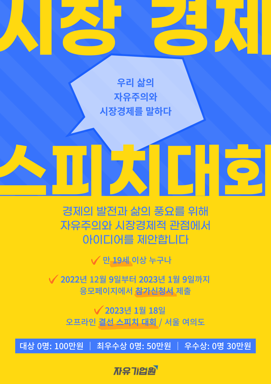 “우리 삶의 자유주의와 시장경제를 말하다” 자유기업원이 제1회 시장경제 스피치 대회를 개최합니다. 우리의 삶 곳곳에 녹아 있는 자유주의와 시장경제 논제에 대한 자신의 목소리를 들려주세요!